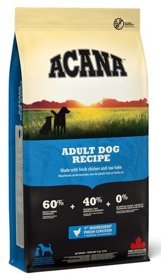 ACANA Adult Dog zawiera pełnowartościowe białko zwierzęce: kurczaka oraz morszczuka. Składniki te dostarczane są do naszej kuchni ŚWIEŻE lub SUROWE.