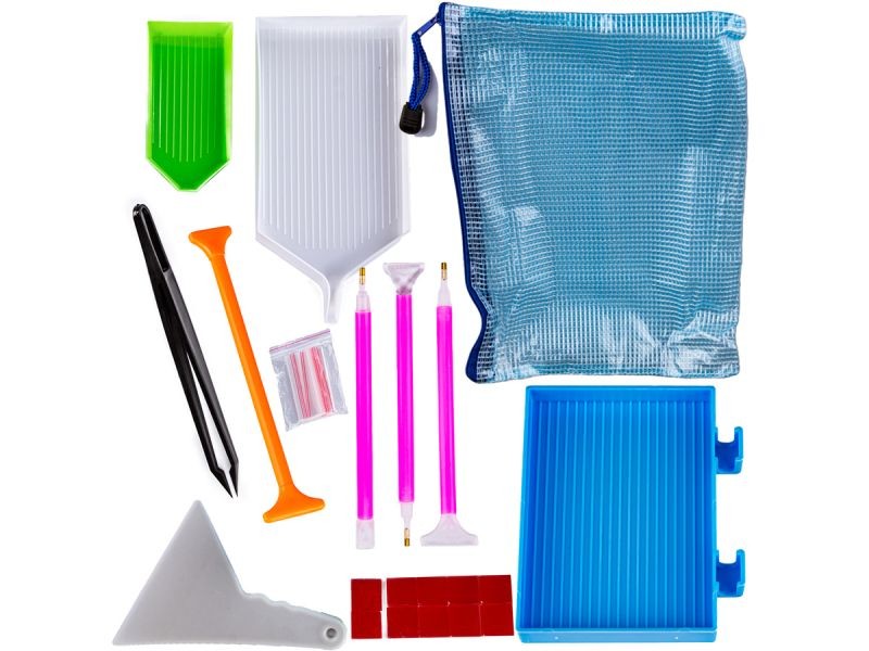 Zestaw dodatkowych akcesoriów do haftu diamentowego, który składa się z wielu przydatnych elementów. Zestaw ten ułatwi i uprzyjemni zabawę w wyklejanie diamencików.