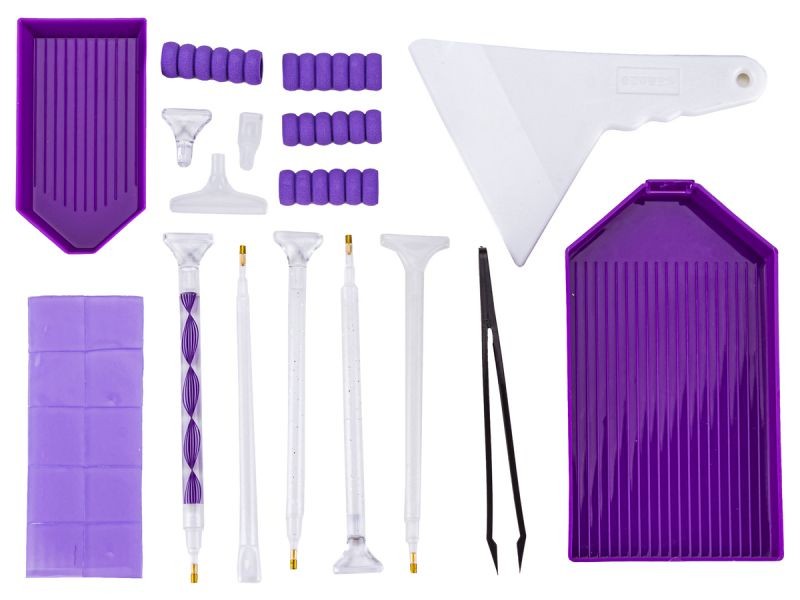Zestaw dodatkowych akcesoriów do haftu diamentowego, który składa się z wielu przydatnych elementów. Zestaw ten ułatwi i uprzyjemni zabawę w wyklejanie diamencików.