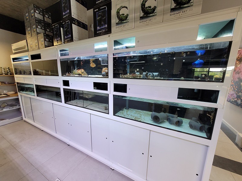 Zestaw czterech białych regałów sprzedażowych, który obsługuje sump o wymiarach 133x60x50cm (dostępny w naszej ofercie). Możliwość przerobienia systemu we własnym zakresie. Zasuwy dolne DIBOND. Wymiary zbiorników szklanych: 112x58x50- 8 sztuk (6 zbiorników dzielonych i 2 pełne). Produkt używany.
