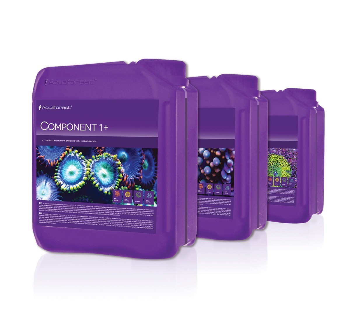 Component 3+ zawiera: Mg, sole mineralne oraz K, B (25ml podnosi Mg o 0,38 ppm/100L) Component 3 zawiera Reef Mineral Salt, produkt niezbędny do prawidłowej stabilizacji parametrów w akwarium.