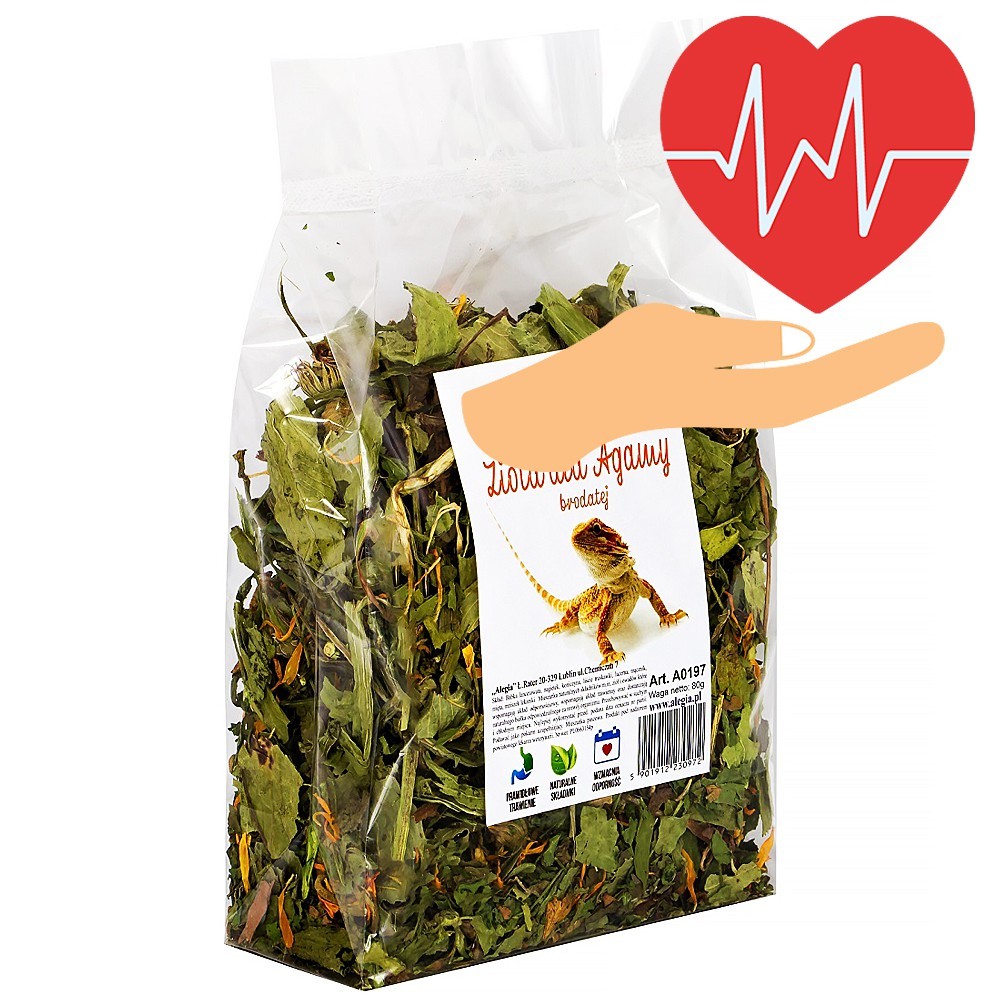 Alegia Zioła dla agamy brodatej 80g to specjalnie skomponowana mieszanka suszonych ziół i kwiatów z dodatkiem larw mącznika dopasowanych do diety Agam, zapewniająca naturalne witaminy oraz minerały.