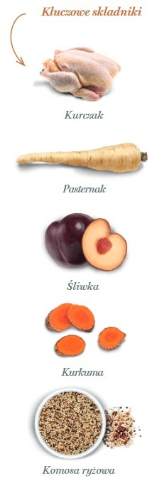 świeżo przygotowany kurczak 71% (używamy 140 kg świeżo przygotowanego kurczaka do wyprodukowania 100 kg naszego produktu), cały zielony groszek, brązowy ryż, hydrolizat wątroby kurczaka, drożdże (Saccharomyces cerevisiae), białko grochu, tapioka, błonnik jabłkowy, minerały, olej rybny (chroniony naturalnymi tokoferolami), olej z kurczaka (chroniony naturalnymi tokoferolami), psyllium, odwodniona dynia, kryl antarktyczny, wodorosty kelp, spirulina, komosa ryżowa 1 000 mg/kg, biała marchew 1 000 mg/kg, odwodniony jarmuż, odwodnione śliwki 1 000 mg/kg, cykoria (źródło FOS) 1 000 mg/kg, hydrolizowana ściana komórkowa drożdży (źródło MOS) 1 000 mg/kg, ekstrakt z mandarynki, kurkuma 500 mg/kg, imbir, yucca schidigera, rozmaryn.