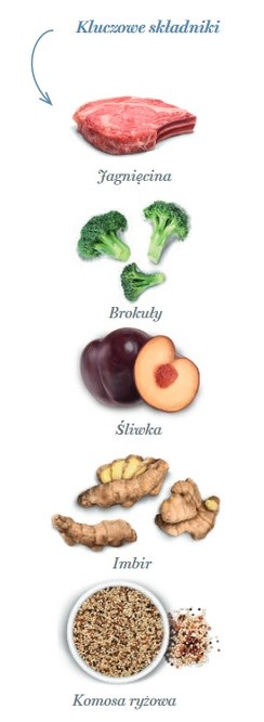 Świeżo przygotowana jagnięcina 58% (używamy 100 kg świeżo przygotowanej jagnięciny do wytworzenia 100 kg naszego produktu), cały zielony groszek, białko ziemniaczane, białko ryżowe, lignoceluloza, hydrolizat wątroby jagnięcej, błonnik jabłkowy, drożdże (Saccharomyces cerevisiae), brązowy ryż, minerały, nasiona lnu (naturalne źródło kwasów tłuszczowych omega 3), białko grochu, tapioka, olej z kurczaka (chroniony naturalnymi tokoferolami), sproszkowany słód jęczmienny, olej rybny (chroniony naturalnymi tokoferolami), psyllium, odwodniona dynia, odwodniony jarmuż, kryl antarktyczny, wodorosty kelp, spirulina, komosa ryżowa 1,000 mg/kg, odwodnione brokuły 1,000 mg/kg,