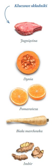 Świeżo przygotowana jagnięcina 65% (używamy 130 kg świeżo przygotowanej jagnięciny do wyprodukowania 100 kg naszego produktu), odwodniony ziemniak, cały zielony groszek, błonnik jabłkowy, białko grochu, minerały, hydrolizat wątroby jagnięcej, drożdże (Saccharomyces cerevisiae), białko ziemniaczane, olej rybny (chroniony naturalnymi tokoferolami), nasiona lnu (naturalne źródło kwasów tłuszczowych omega 3), glukozamina 1. 400 mg/kg, 400 mg/kg, odwodniona dynia 1,000 mg/kg, odwodnione brokuły, odwodniony jarmuż, kryl antarktyczny, wodorosty kelp, żurawina, spirulina, imbir 1,000 mg/kg, biała marchew 1,000 mg/kg, cykoria (źródło FOS) 1,000 mg/kg, hydrolizowana ściana komórkowa drożdży (źródło MOS) 1,000 mg/kg, chondroityna 1,000 mg/kg, odwodniona pomarańcza 500 mg/kg, rozmaryn, Yucca schidigera.