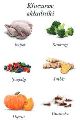 świeży indyk 64%, żurawina 2,60%, dynia 2%, minerały, siemię lniane 0,03%, glukozamina 300 mg/kg, inulina (źródło FOS) 0,02%, hydrolizowana ściana komórkowa drożdży (źródło MOS) 0,02%, chondroityna 215 mg/kg, brokuły 100 mg/kg, imbir 100 mg/kg, goździki 100 mg/kg.