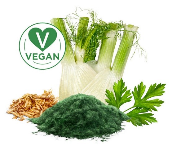 produkty pochodzenia roślinnego (w tym włókno celulozowe 4%, lukrecja korzeń 0,4%, koper włoski 0,1%, pietruszka 0,09%), minerały, ascophyllum nodosum (1,0%).