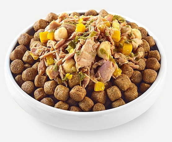 Filet z tuńczyka 45%, bulion rybny, dynia 10%, ciecierzyca 10%, jarmuż 5%.