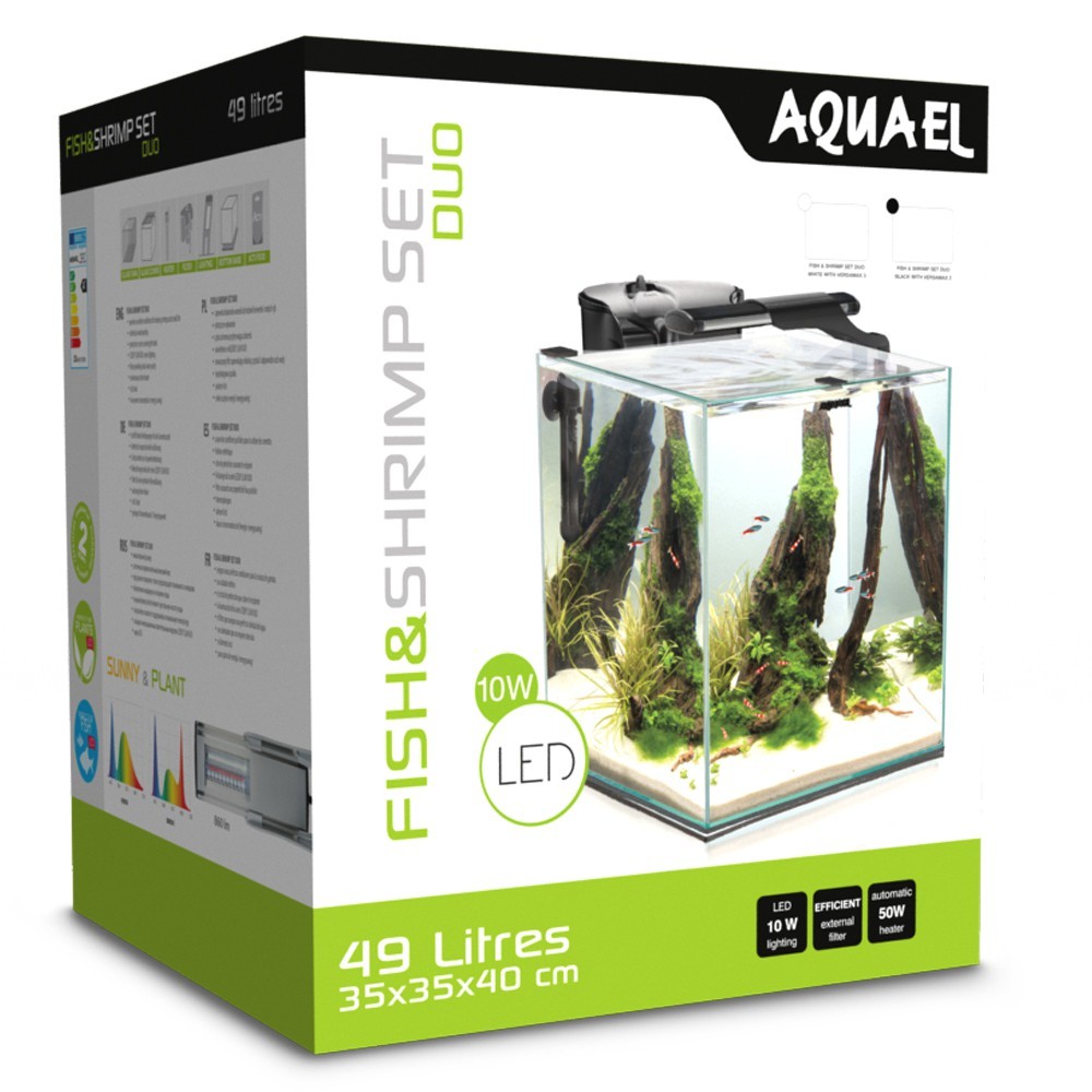 Stanowi uzupełnienie oferty zestawów krewetkariów SHRIMP SET dostępnej w portfolio firmy AQUAEL. Składa się z nowoczesnego zbiornika klejonego transparentnym silikonem o kształcie zbliżonym do sześcianu i wymiarach 35x35x40 cm (pojemność 49 l) wyposażonego w szklaną pokrywę z wycięciem do instalacji filtra kaskadowego. Pokrywa posiada system SMART OPEN – po podniesieniu utrzymuje się w pozycji pionowej zaczepiona o krawędź tylnej szyby zbiornika. W skład zestawu wchodzi również ochronna mata gąbkowa zabezpieczająca dno akwarium.