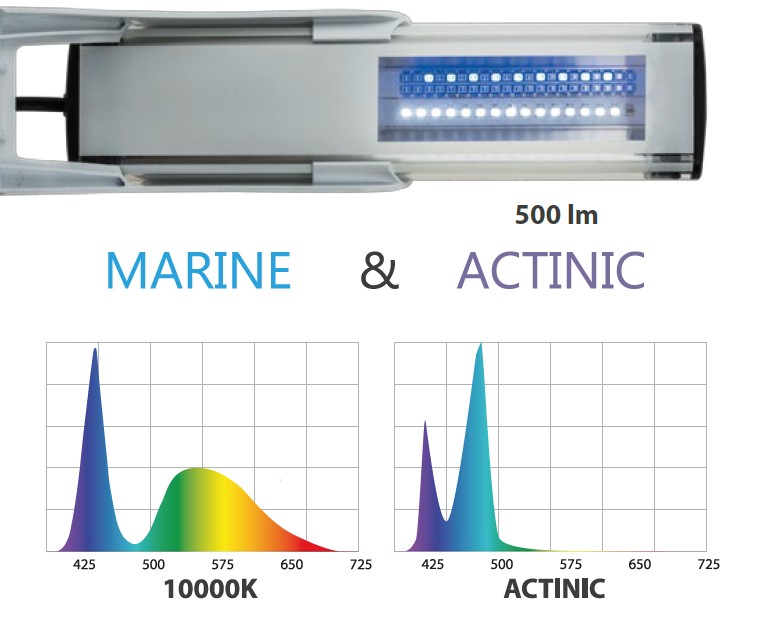 Dodatkowo do zestawu dołączona jest mata ochronna zabezpieczająca dno. Wyposażenie techniczne stanowi podwójna, nowoczesna lampa LEDDY SLIM DUO MARINE&ACTINIC. Jej zastosowanie umożliwia uzyskanie wyjątkowego efektu dekoracyjnego oraz dużą oszczędność wynikającą z niskiego zużycia energii elektrycznej oraz braku konieczności częstego wymieniania źródła światła. Lampa zawiera dwa rzędy diod o łącznej mocy 10 W. Połowę stanowią diody MARINE, emitujące silne, białe światło o temperaturze barwowej 10000 K, zapewniające dobry rozwój koralowców. Pozostałe diody ACTINIC emitują niebieskie światło o temperaturze barwowej 20000 K, które podkreśla barwy zwierząt morskich.