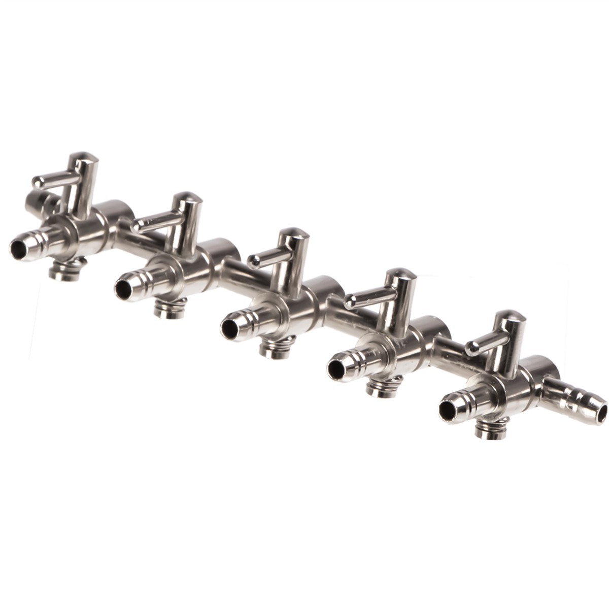 Metalowy rozgałęziacz wraz z pięcioma zaworkami regulującymi przepływ powietrza.