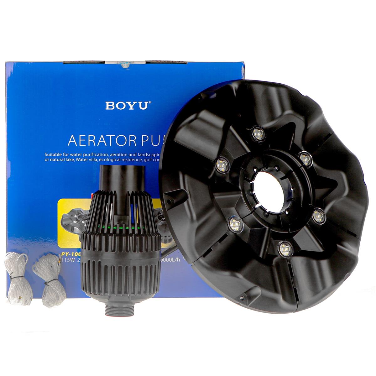 Pływający napowietrzacz fontannowy BOYU PY-10000 z oświetleniem LED proste i skuteczne rozwiązanie do wzbogacania tlenem wody w oczku wodnym, oraz aranżacją świetlną. Zasilany jest pompą o wysokiej wydajności 20000l/h i energooszczędnym silniku 115W.