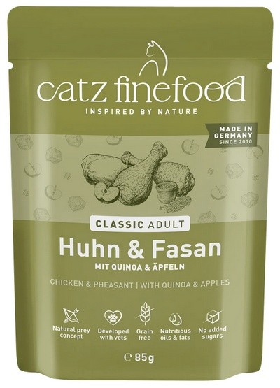 Specjał dla kotów – wartościowa karma dla naszych pupili. Catz finefood N°15 zawiera dużo delikatnego kurczaka, bażanta oraz wartościowe dodatki, jak rzeżucha i mniszek lekarski. Bez konserwantów, barwników i wzmacniaczy smaku. Nie zawiera GMO. Mmmmiau!