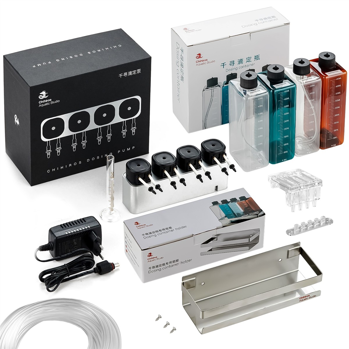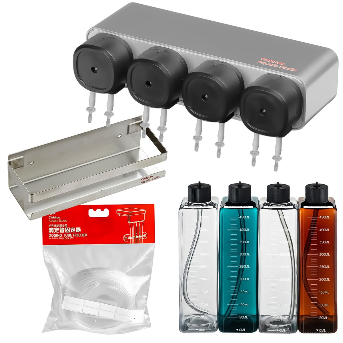 Chihiros Dosing System to kompletny zestaw składający się z automatycznego dozownika, czterech butelek, uchwytu i węża. Profesjonalny zestaw dozujący jest gotowy do użytku i obejmuje wyłącznie oryginalne akcesoria Chihiros. System składa się z kilku butelek, które za pomocą węża są połączone z pompą dozującą. Dzięki zestawowi można precyzyjnie kontrolować ilość podawanych substancji takich jak nawozy, odżywki czy sole.