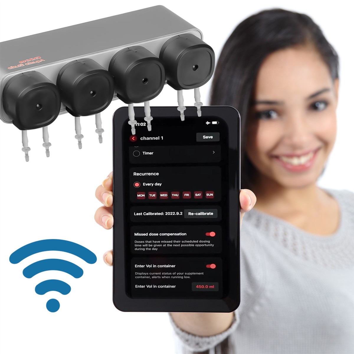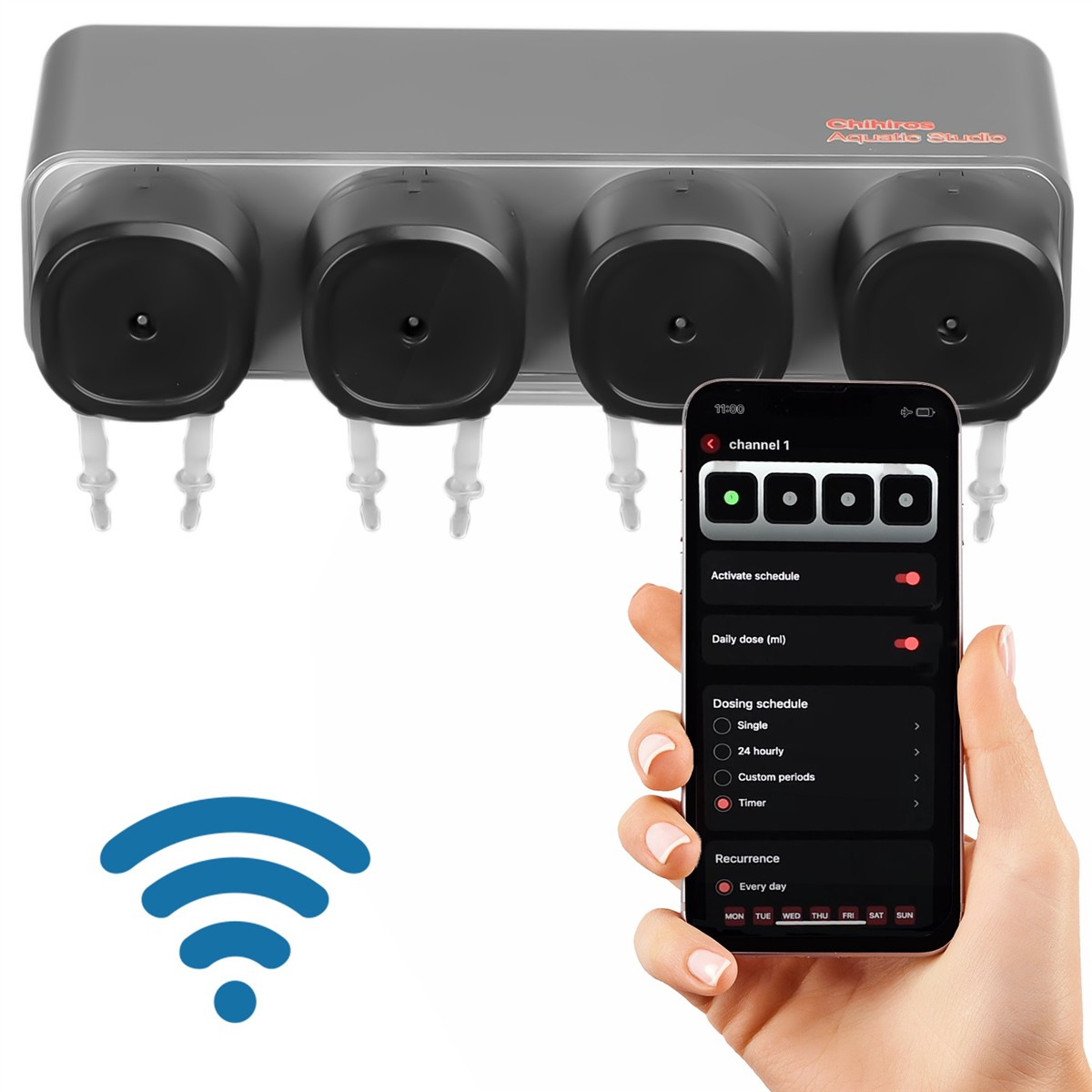 Precyzyjna pompa dozująca do akwarium sterowana jest za pomocą aplikacji My Chihiros dostępnej zarówno na urządzenia mobilne z systemem operacyjnym iOS i Android. Posiada możliwość precyzyjnego regulowania dawki, dzięki czemu możesz ustawić dokładną ilość płynu, jaka ma zostać podana. Urządzenie składa się z czterech programowalnych pomp, które mogą być konfigurowane w taki sposób, aby podawały dawki w precyzyjnie określonym czasie. Całkowita dzienna dawka powinna mieścić się przedziale od 0,2 do 999,9ml. Ilość dawek możliwych do zaprogramowania to od 1 do 24 dziennie. Automatyczne dawki mogą być podawane o wyznaczonej godzinie, a ich liczbę można zmienić w dowolnym momencie.