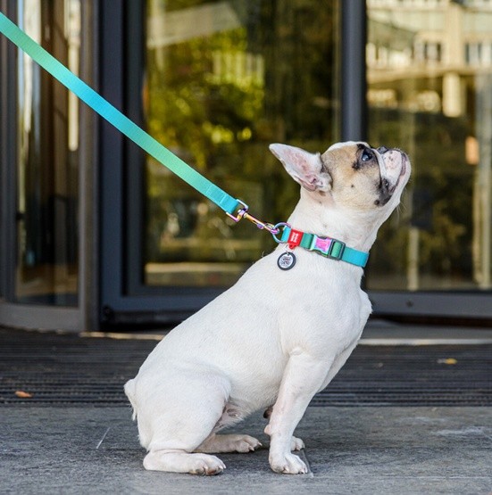 Obroża wykonana jest z przyjaznego dla środowiska i zrównoważonego materiału R-PET, który jest produkowany z plastikowych butelek pochodzących z recyklingu.
