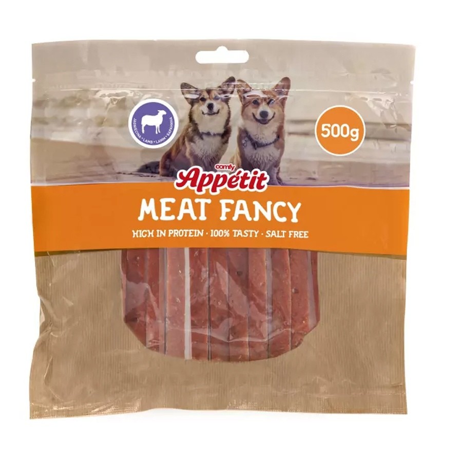 COMFY APPETIT MEAT FANCY PASKI JAGNIĘCINY to wysokobiałkowy, niskokaloryczny przysmak dla psów przygotowany bez dodatku cukrów, soli i glutenu. Zawiera aż 90% mięsa z jagnięciny.