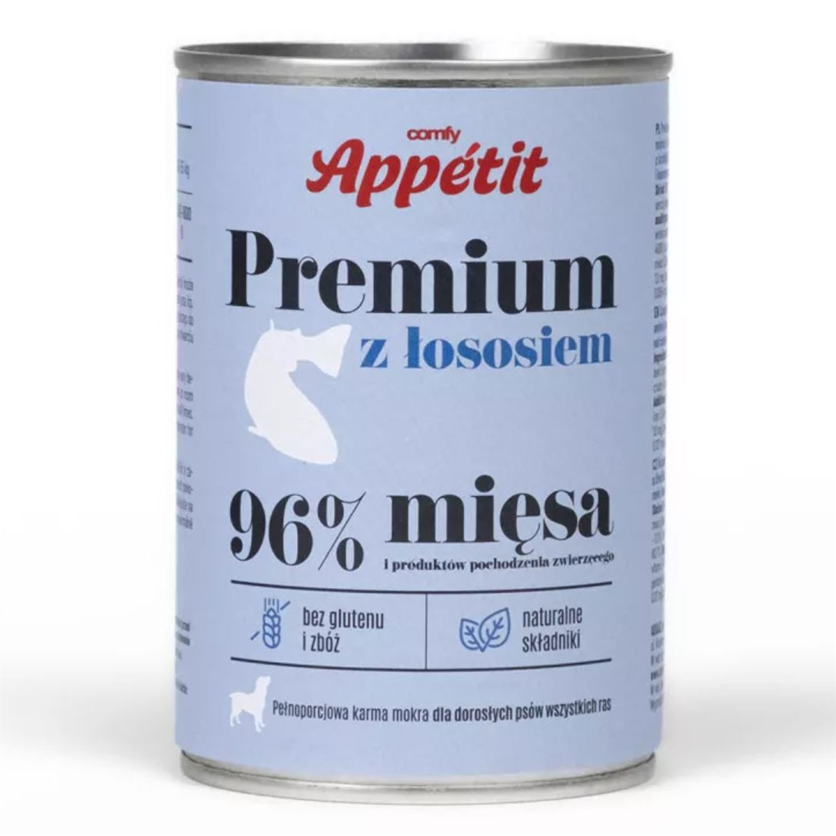 Comfy Appetit PREMIUM to pełnoporcjowa mokra karma dla psów dorosłych, stworzona na bazie naturalnych składników. Twój zwierzak pokocha tę wyselekcjonowaną mieszankę mięsną z łososiem! Pokarm zawiera 96% mięsa, ryb oraz składników pochodzenia zwierzęcego i jest wzbogacony o witaminy i minerały. Produkt w postaci aromatycznego, delikatnego pasztetu jest wolny od konserwantów, wzmacniaczy smaku, zbóż oraz sztucznych barwników.