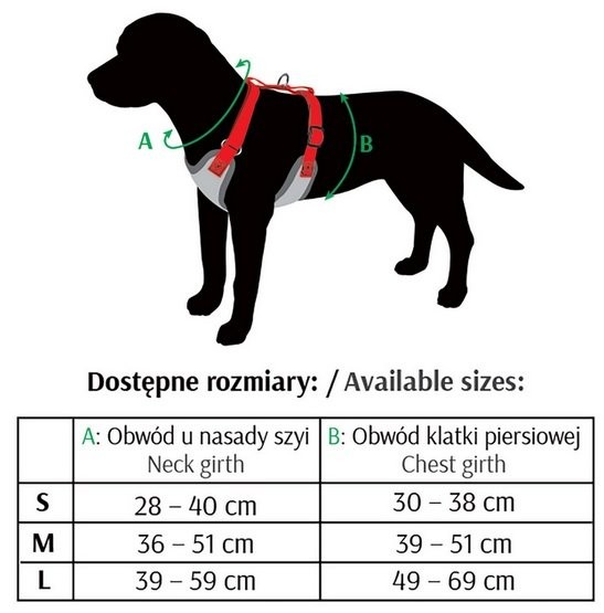 | Rozmiar | Obwód u nasady szyi (A) | Obwód klatki piersiowej za przednimi łapkami (B) |