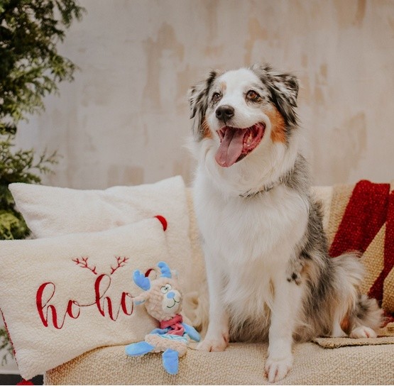 Świąteczna zabawka dla psa jest stworzona z płaskiego, polarowo - pluszowego materiału, a wewnątrz znajduje się bezpieczny wypełniacz. Pośród wypełnienia znajduje się szeleszczący materiał i piszczałka, pobudzające do zabawy.