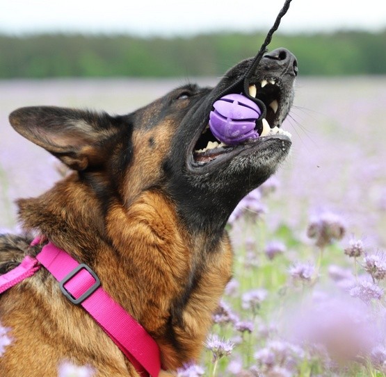 Piłka została wykonana z twardej gumy, a w środku jest pełna - dzięki temu jest bardzo wytrzymała i nadaje się nawet dla najbardziej wymagających psiaków.