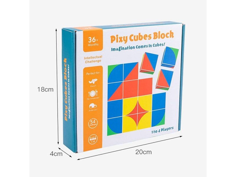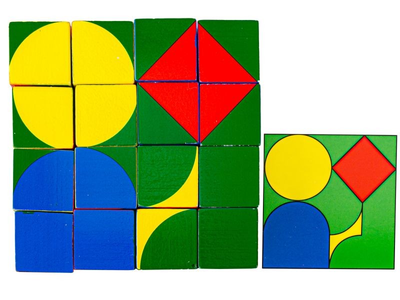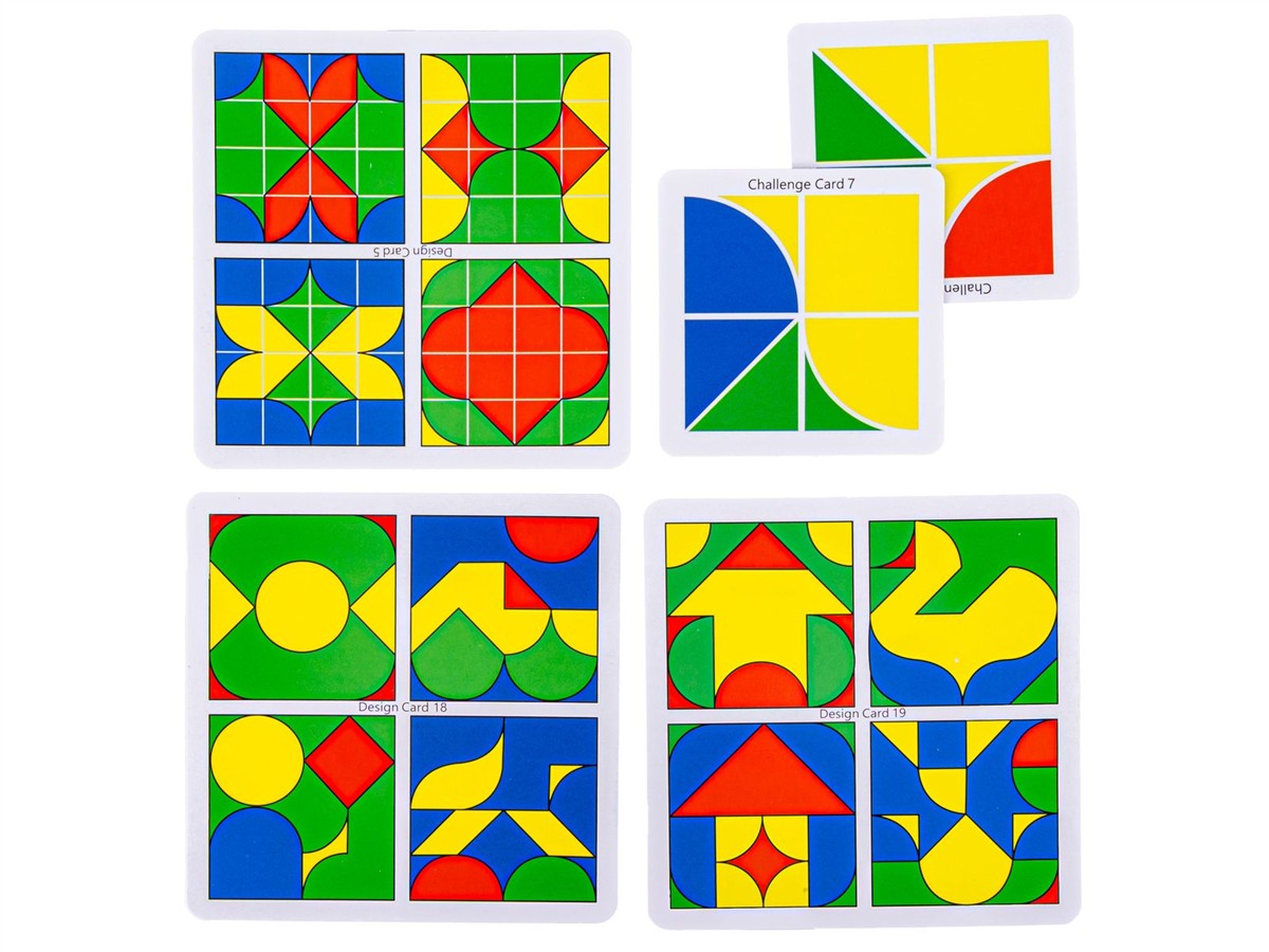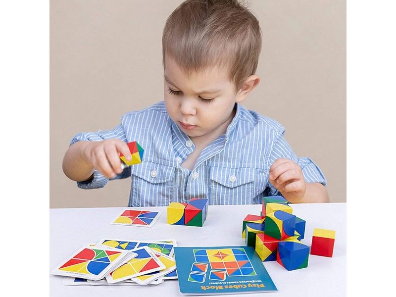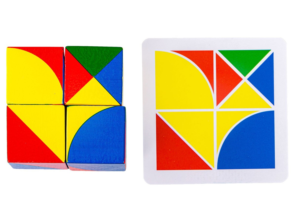 Zabawa polega na tym aby dziecko ułożyło z drewnianych klocków wybrany z szablonu układ. Każdy klocek posiada na ściankach różne wzory i kolory. Poprzez ich odpowiednie dopasowanie możemy stworzyć piękny wzór / układ graficzny.