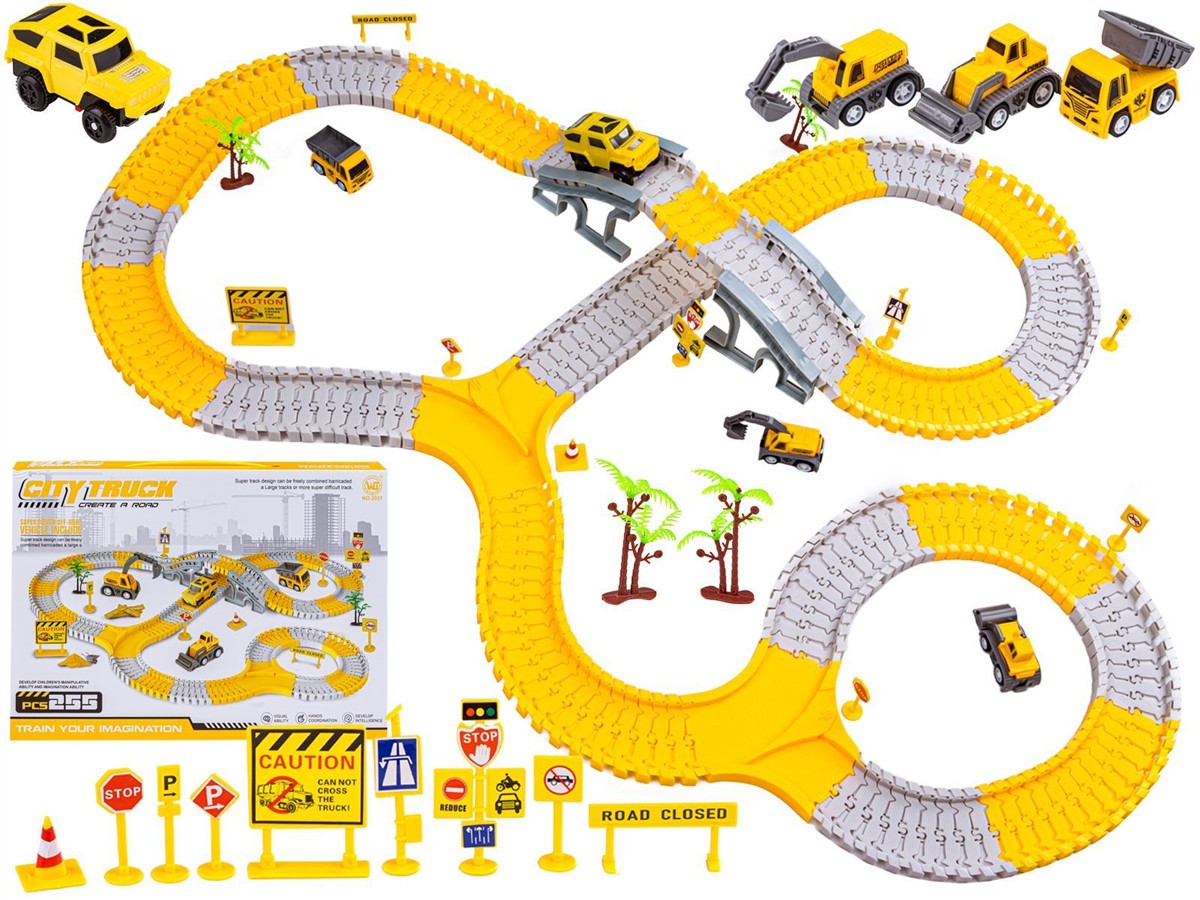 Zestaw oprócz głównego autka zasilanego, który porusza się bezpośrednio po torze wyposażony został w trzy resoraki. Każdy pojazd z kolekcji jest wyjątkowy. Jak na placu budowy tak i w naszym zestawie nie zabrakło koparki, wywrotki i walca. Resoraki posiadają ręczny napęd, który sprawi, że puszczone w ruch nie zatrzymają się szybko :) Oto cała kolekcja - zaproś więc przyjaciół i bawcie się w najlepsze z tymi niepowtarzalnymi pojazdami.