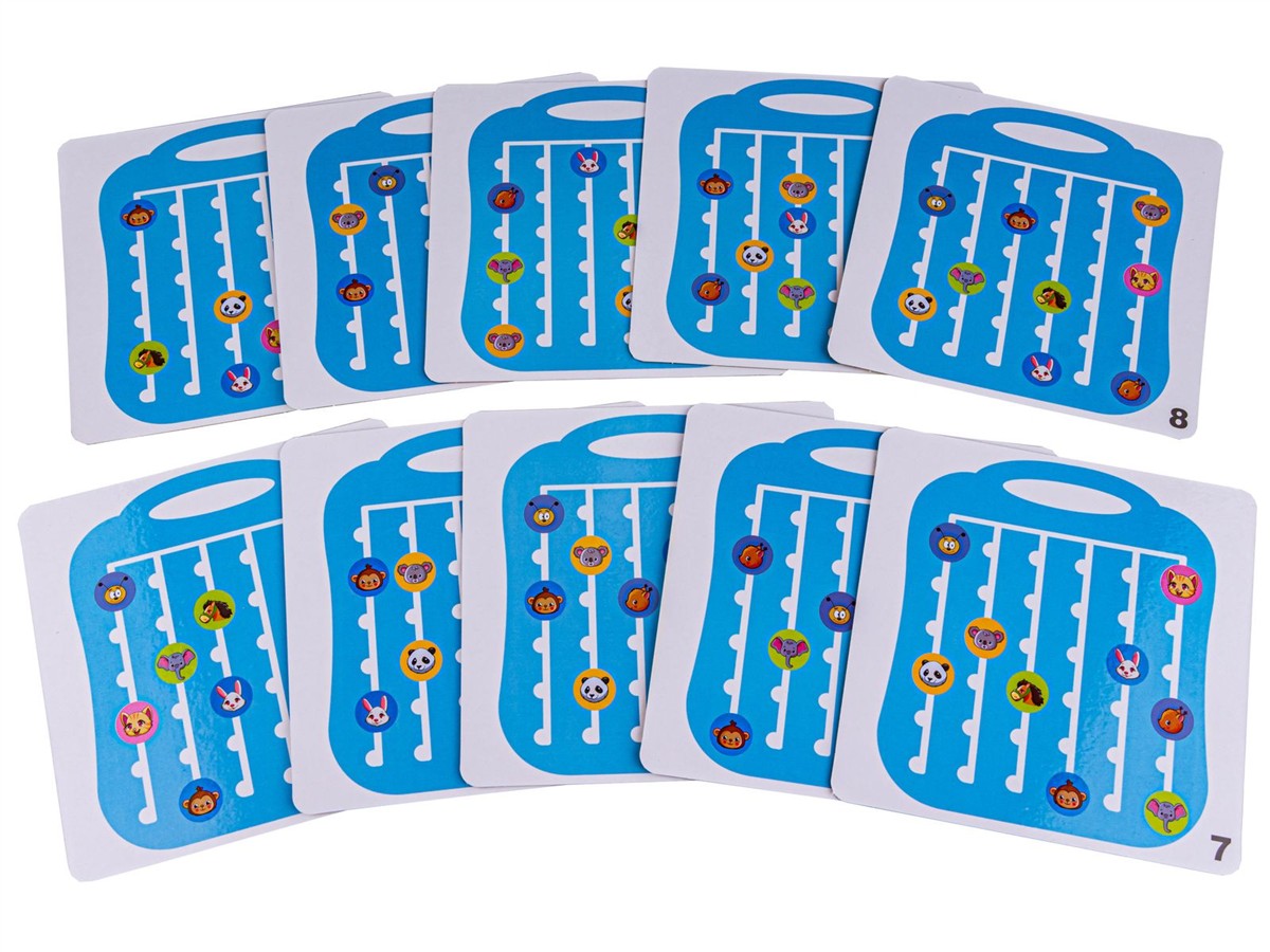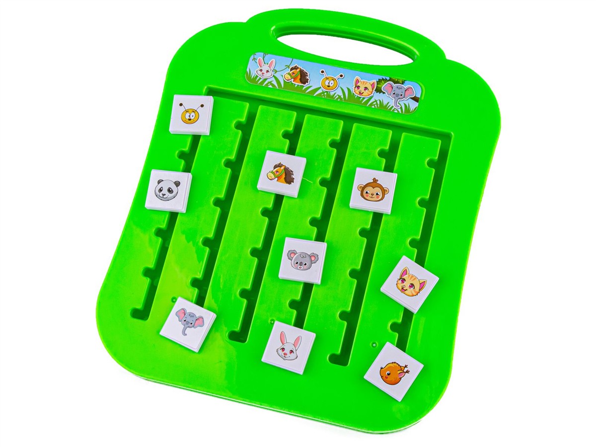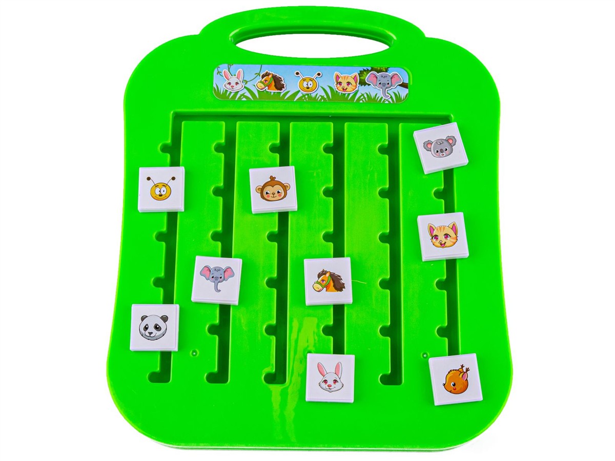 Zadaniem dziecka jest takie ułożenie zwierzątek na planszy jak w wylosowanej karcie. To wcale nie takie proste - zwierzątka mogą się wzajemnie blokować. Aby podnieść poziom trudności można ustalić rozwiązanie zadania w czasie.