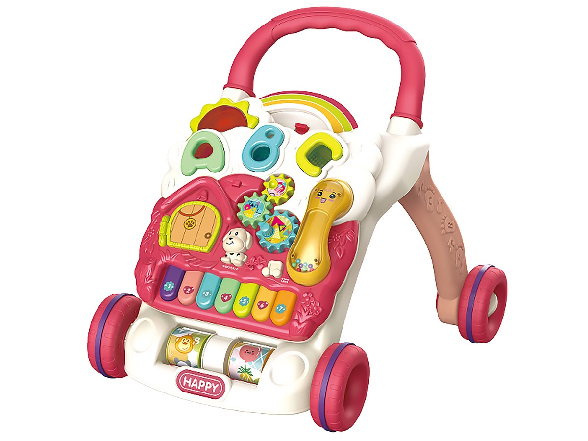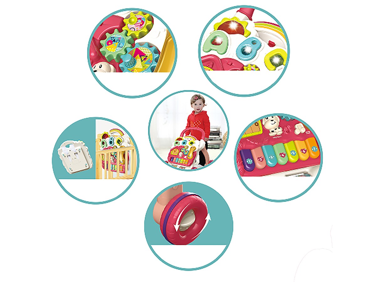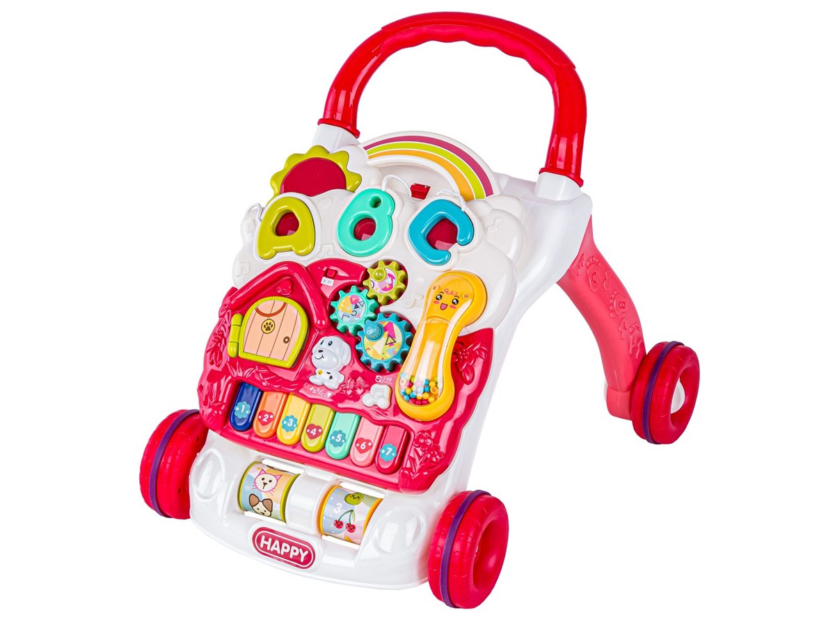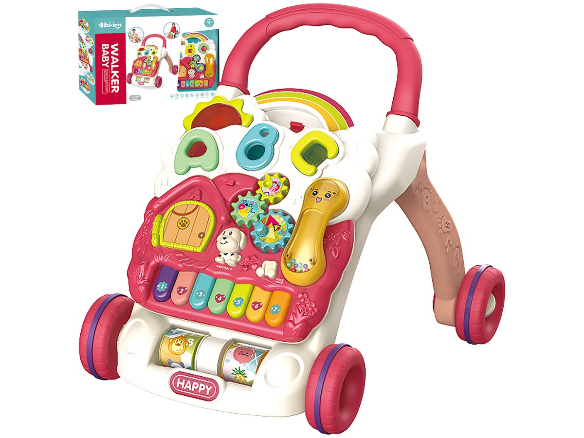 Chodzik w głównym stelażu posiada dwie obrotowe rolki z kolorowymi obrazkami (zwierzęta, owoce, cyferki i literki). Duże gumowane kółka gwarantują większą stabilność oraz cichszą jazdę.