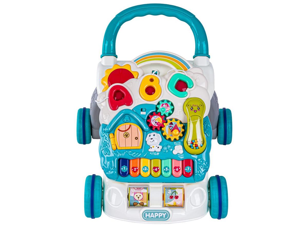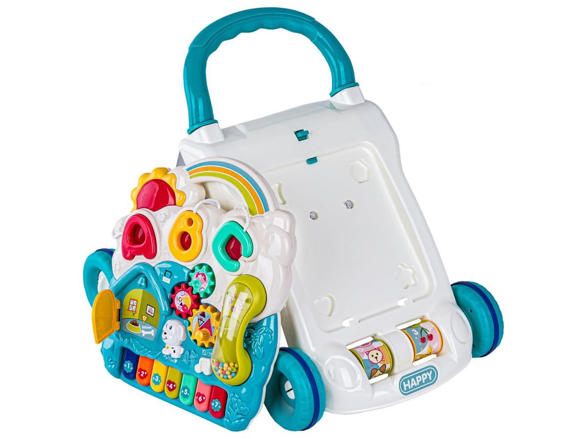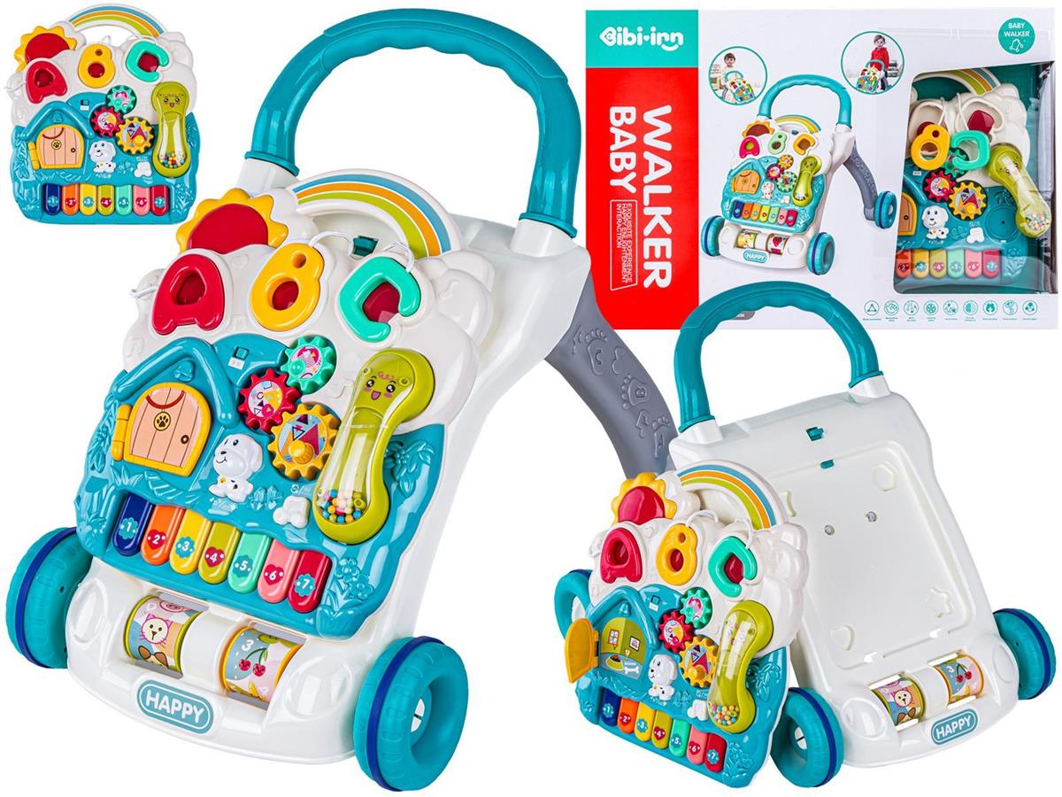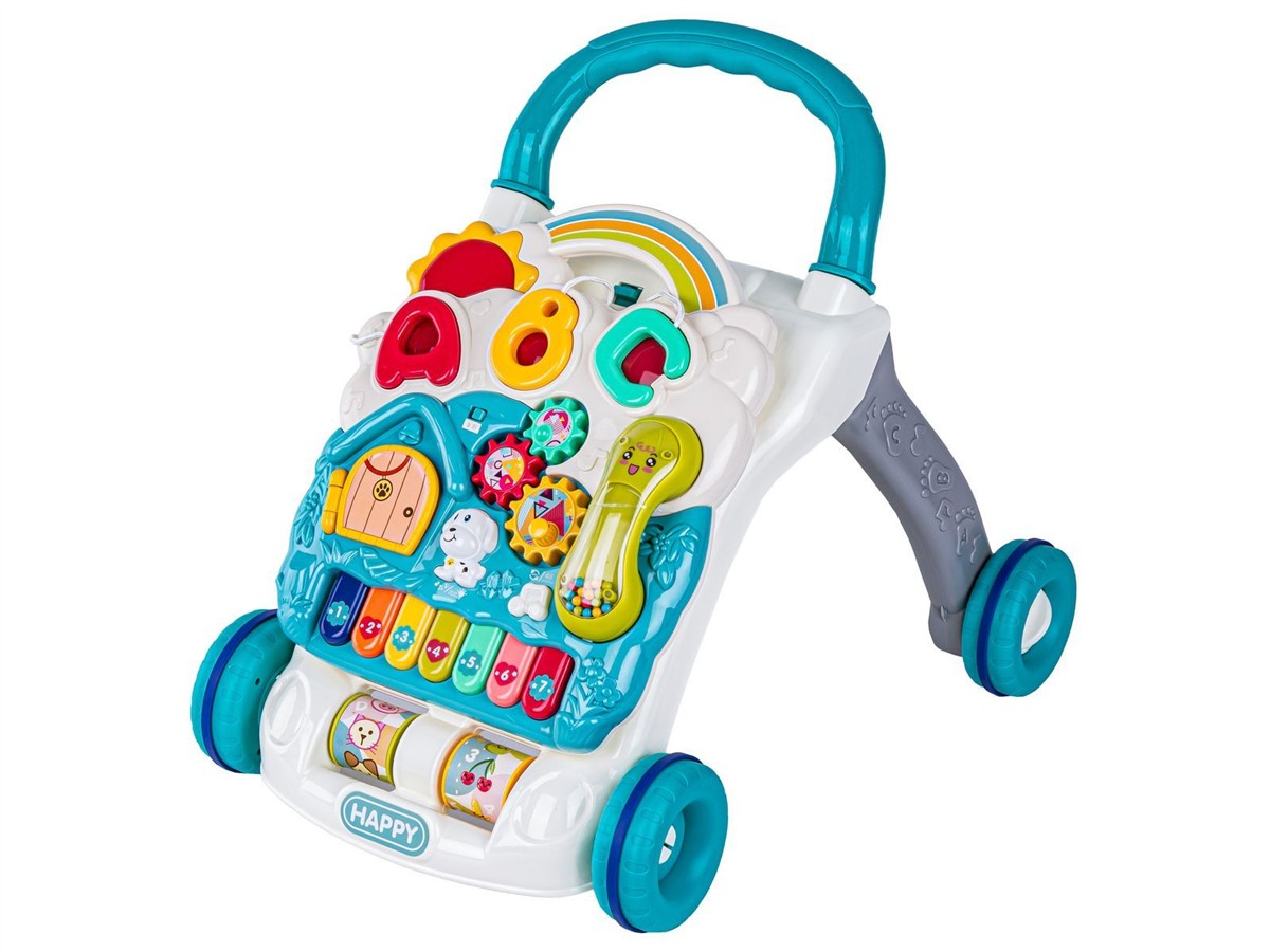 Chodzik w głównym stelażu posiada dwie obrotowe rolki z kolorowymi obrazkami (zwierzęta, owoce, cyferki i literki). Duże gumowane kółka gwarantują większą stabilność oraz cichszą jazdę.
