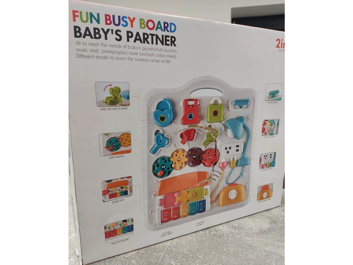 Panel może posłużyć za stolik po zamontowaniu nóżek lub jako zabawka sama w sobie. Zestaw wyposażony został również w dwa paski, które możemy zapiąć od tyłu panelu. Dzięki temu zabawkę możemy powiesić np. na łóżeczku czy ścianie. Panel posiada również uchwyt dzięki czemu łatwo zabrać go ze sobą.