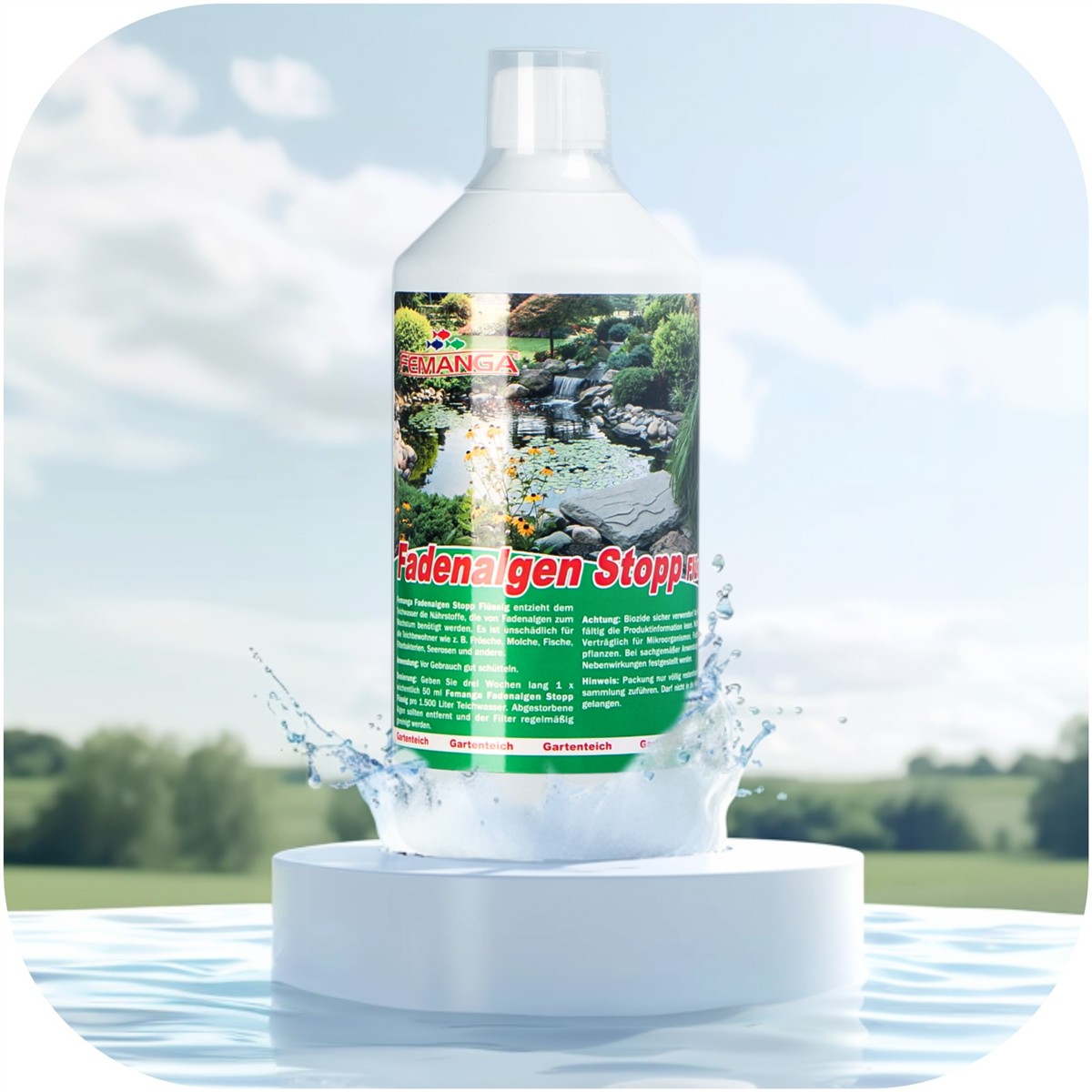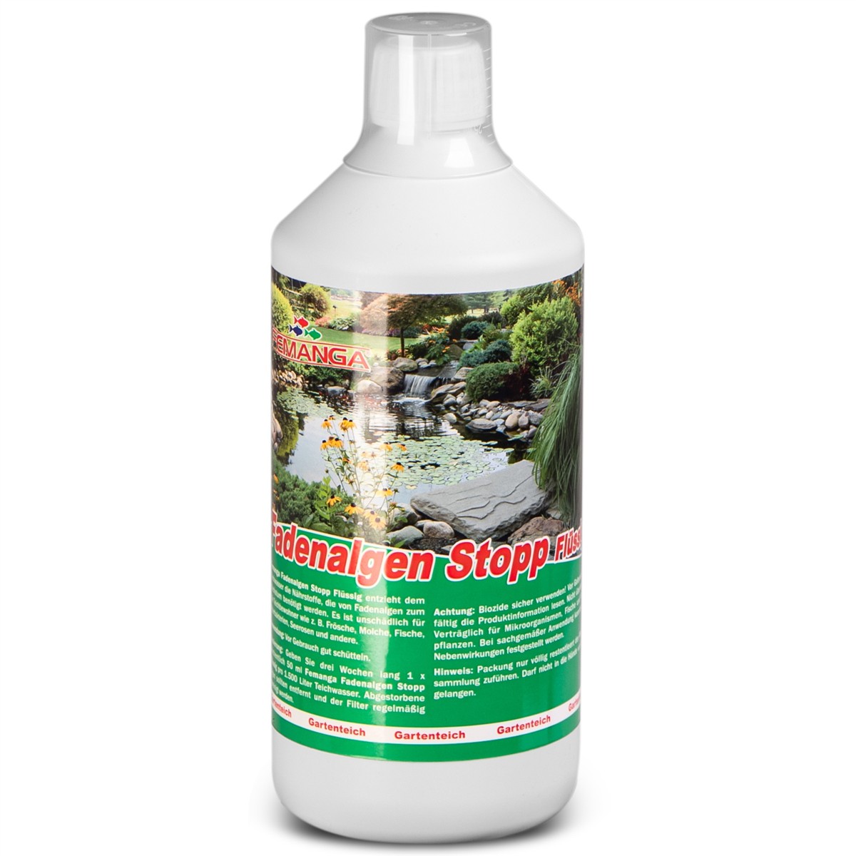 Femanga Fadenalgen Stopp Speed Płyn to niezawodny środek do zwalczania nitkowatych glonów w stawie. Skutecznie usuwa substancje odżywcze niezbędne do ich wzrostu, nie powodując przy tym zmętnienia wody i nie szkodząc mieszkańcom stawu ani roślinom wodnym.