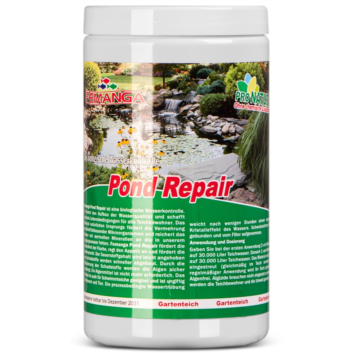 Femanga Pond Repair to biologiczny środek do kontroli jakości wody. Wspomaga poprawę parametrów wody i tworzy optymalne warunki życia dla wszystkich mieszkańców stawu. Naturalne materiały sprzyjają rozmnażaniu mikroorganizmów rozkładających zanieczyszczenia oraz wzbogacają wodę w cenne minerały, których brakuje w naszej wodzie wyjściowej. Femanga Pond Repair wspomaga zdrowie ryb, pobudza apetyt i intensyfikuje ich barwy. Poziom tlenu jest lekko podwyższony, a zanieczyszczenia są szybciej rozkładane.