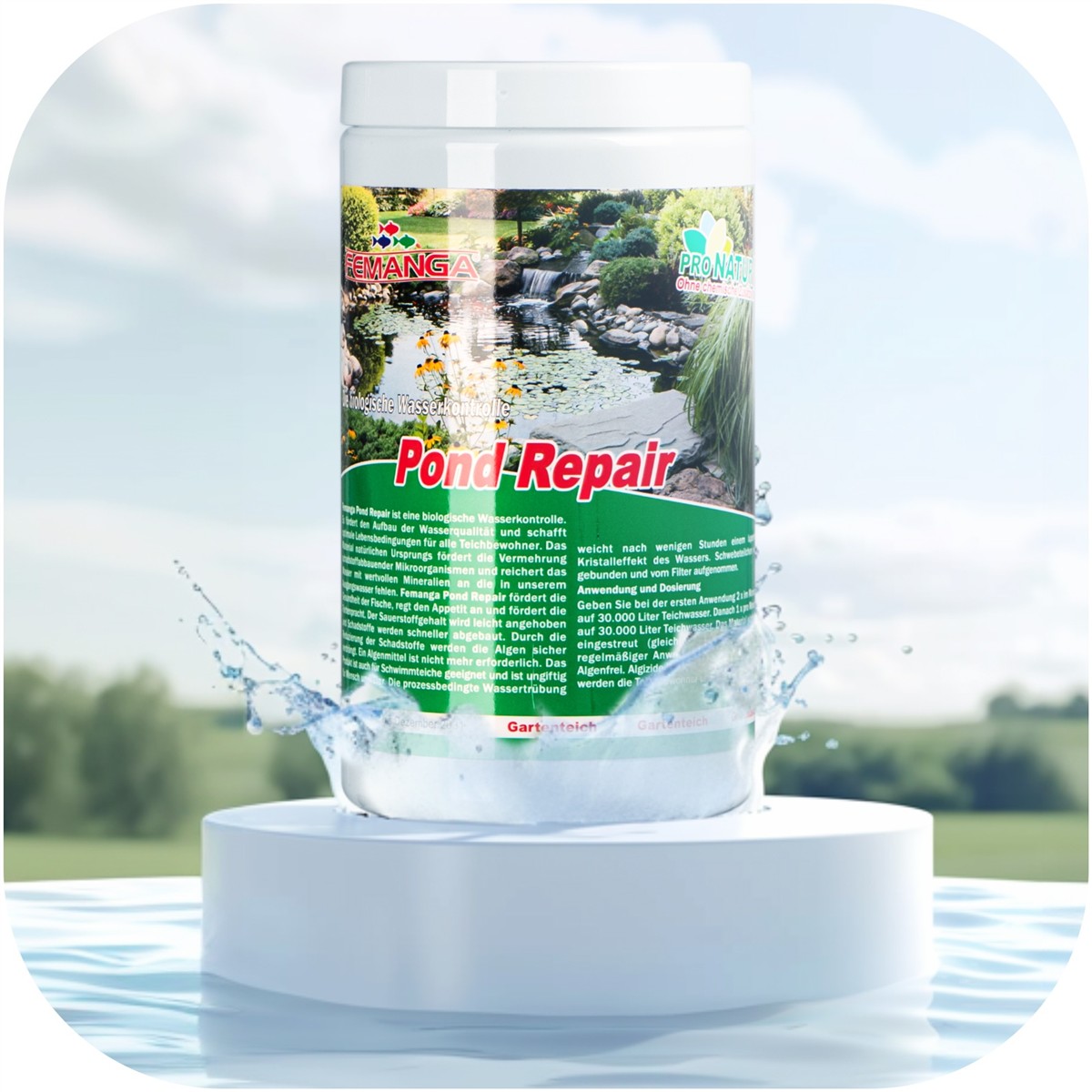 Femanga Pond Repair to biologiczny środek do poprawy jakości wody w stawach. Wzbogaca wodę w minerały, wspomaga zdrowie ryb i eliminuje zanieczyszczenia. Redukuje glony bez potrzeby stosowania algicydów. Produkt jest bezpieczny dla ludzi i zwierząt.