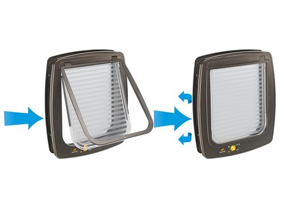 Dodatkowo modele Swing 5, 7 i 9 są wyposażone we wskaźnik przejścia, który pomoże ci błyskawicznie ocenić, gdzie znajduje się twoje zwierzę. Wskaźnik przejścia to "flaga" umieszczona na dnie klapy - będzie wskazywała kierunek, w którym twój pupil ostatnio przechodził.