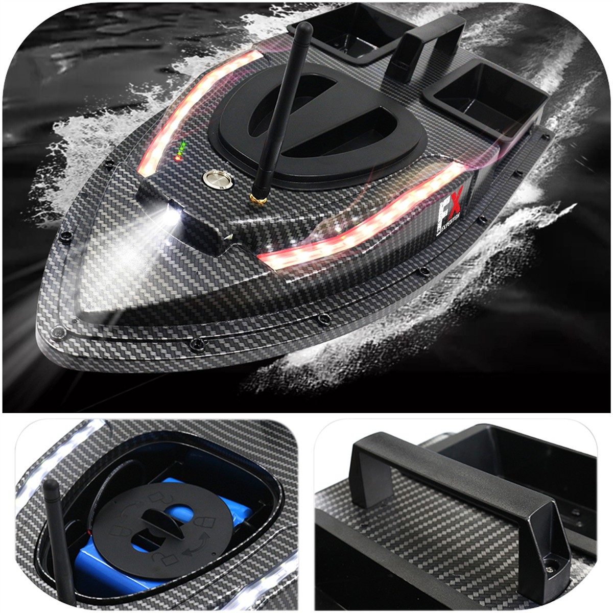 Łódka posiada dwa zbiorniki, które łącznie pomieszczą aż 1,5kg przynęty i przyciągną ławicę ryb. Zbiornikami możesz sterować osobno. Dodatkowo w tylnej części łódki znajduje się specjalne miejsce do zamontowania haka z przynętą. Z dobrym wyposażeniem z łatwością przekonasz ryby, że Twój hak to najlepszy posiłek w okolicy.