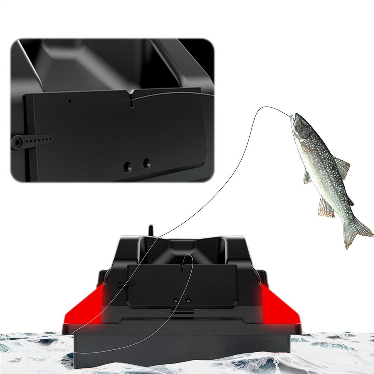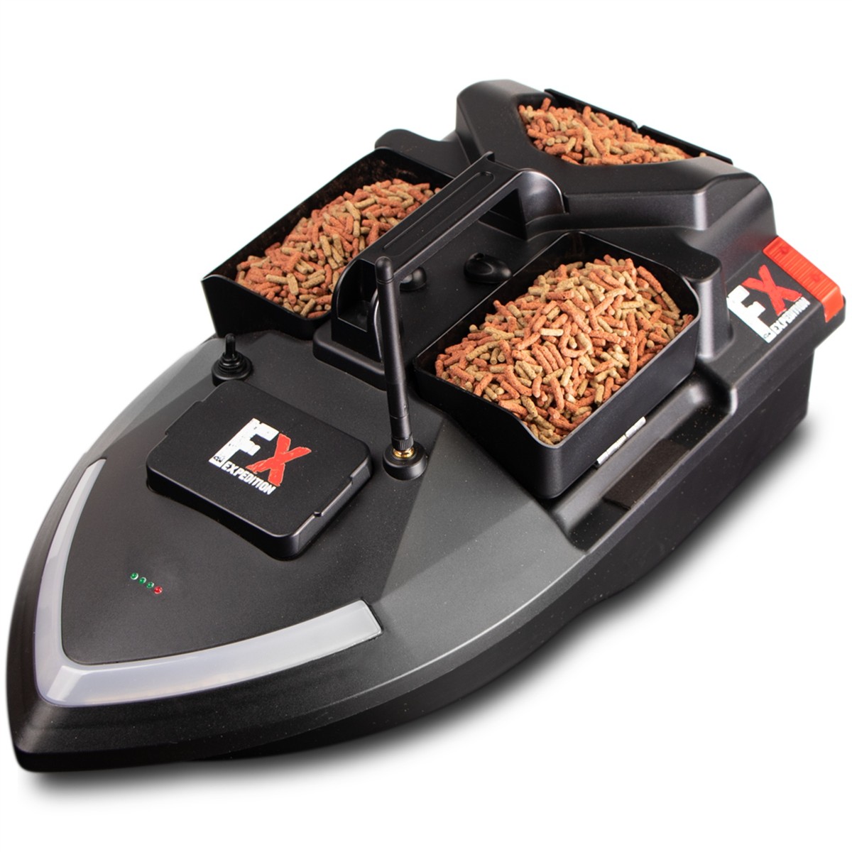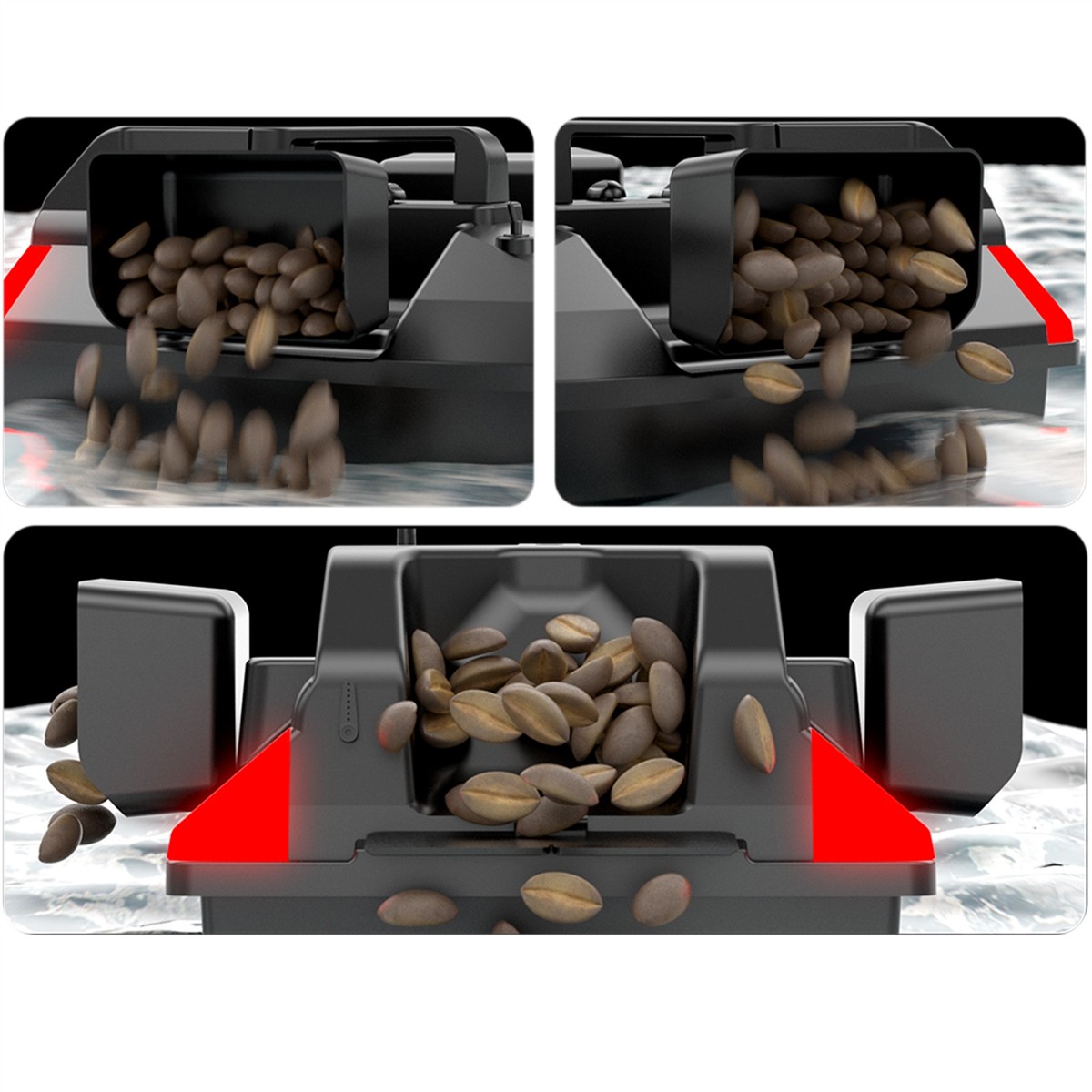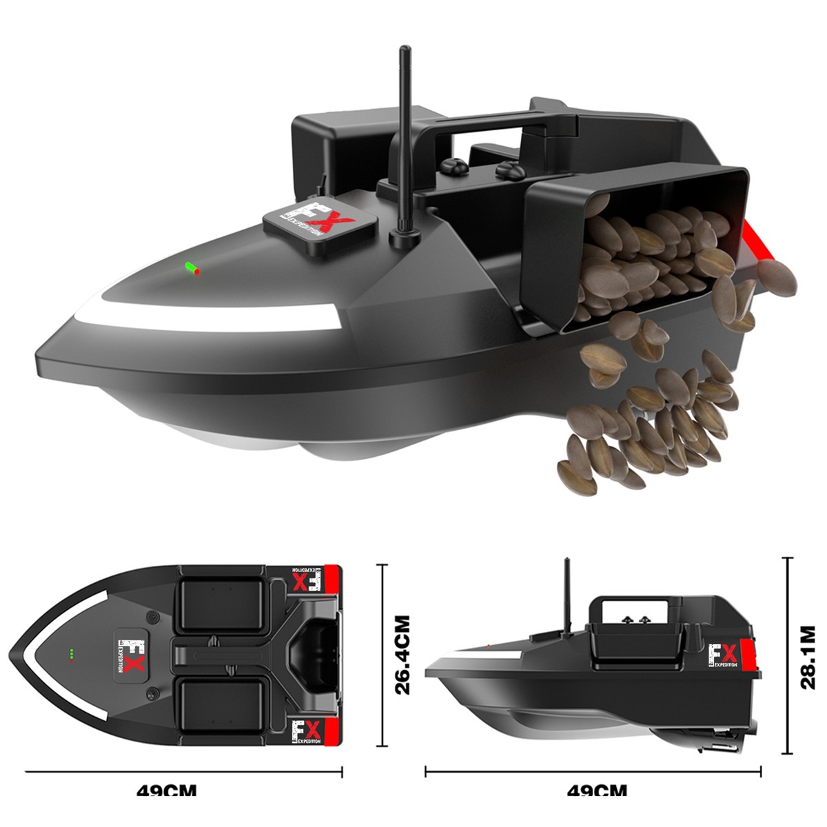 Łódka posiada zbiorniki, które łącznie pomieszczą do 2kg przynęty i przyciągną ławicę ryb. Zbiornikami możesz sterować osobno. Dodatkowo w tylnej części łódki znajduje się specjalne miejsce do zamontowania haka z przynętą. Z dobrym wyposażeniem z łatwością przekonasz ryby, że Twój hak to najlepszy posiłek w okolicy.