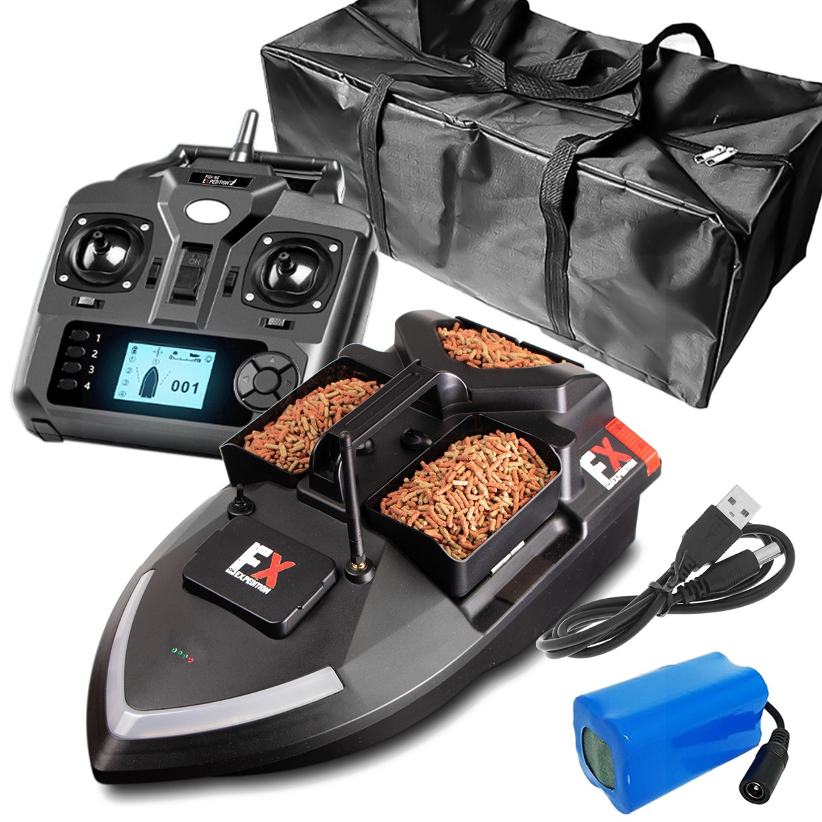 W zestawie: łódka zanętowa, pilot, bateria, kabel USB do ładowania, torba na łódź (w zestawie nie ma "kostki" 230V na USB do ładowania zgodnie z wytycznymi UE)