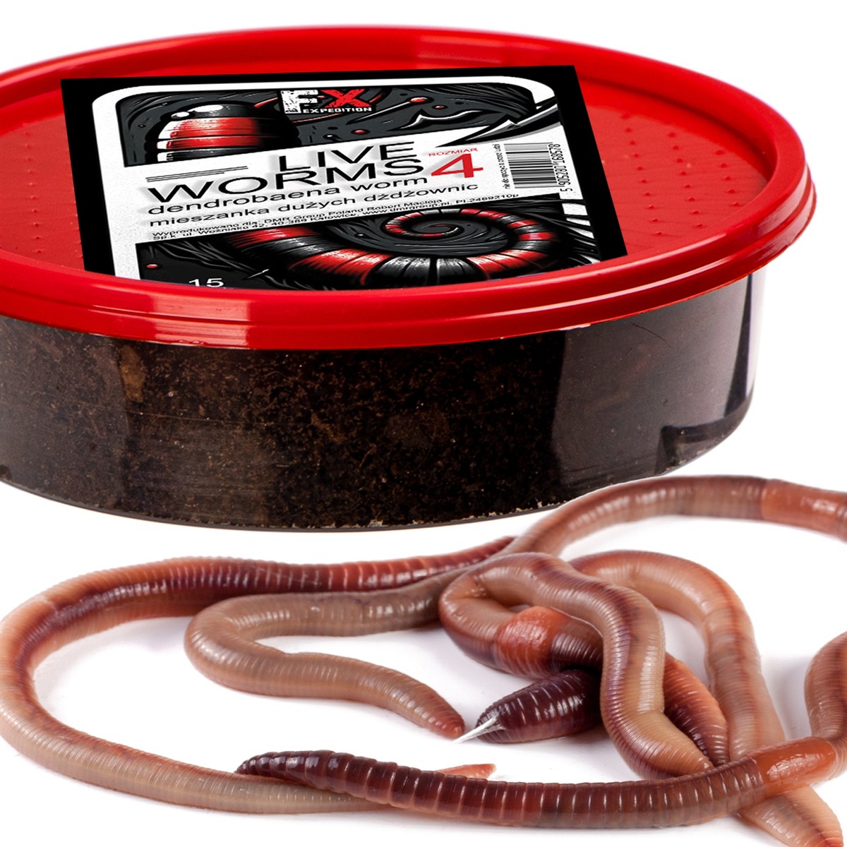 Specjalnie selekcjonowane żywe dżdżownice do rozmiaru No4 – duże i niezwykle atrakcyjne dla ryb. Znane są one z ich fenomenalnej skuteczności jako przynęty, które przyciągają różnorodne gatunki ryb, takie jak Amur Biały, Boleń, Jazgarz, Jaź, Karaś, Karaś Srebrzysty, Karp, Kleń, Krąp, Leszcz, Lin, Okoń, Płoć, Sieja, Ukleja, Węgorz i Wzdręga.