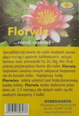 Florwix stopniowo uwalnia związki odżywcze bezpośrednio do korzeni roślin. Pojedynczą kulkę Florwix'u należy umieścić pod bryłą korzeniową każdej rośliny. Florwix działa skutecznie przez okresok.2-3 miesięcy. Do dużych roślin np. lilii stosować 2 kulki.