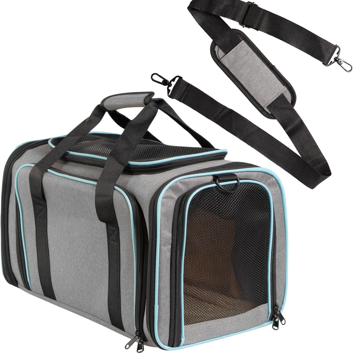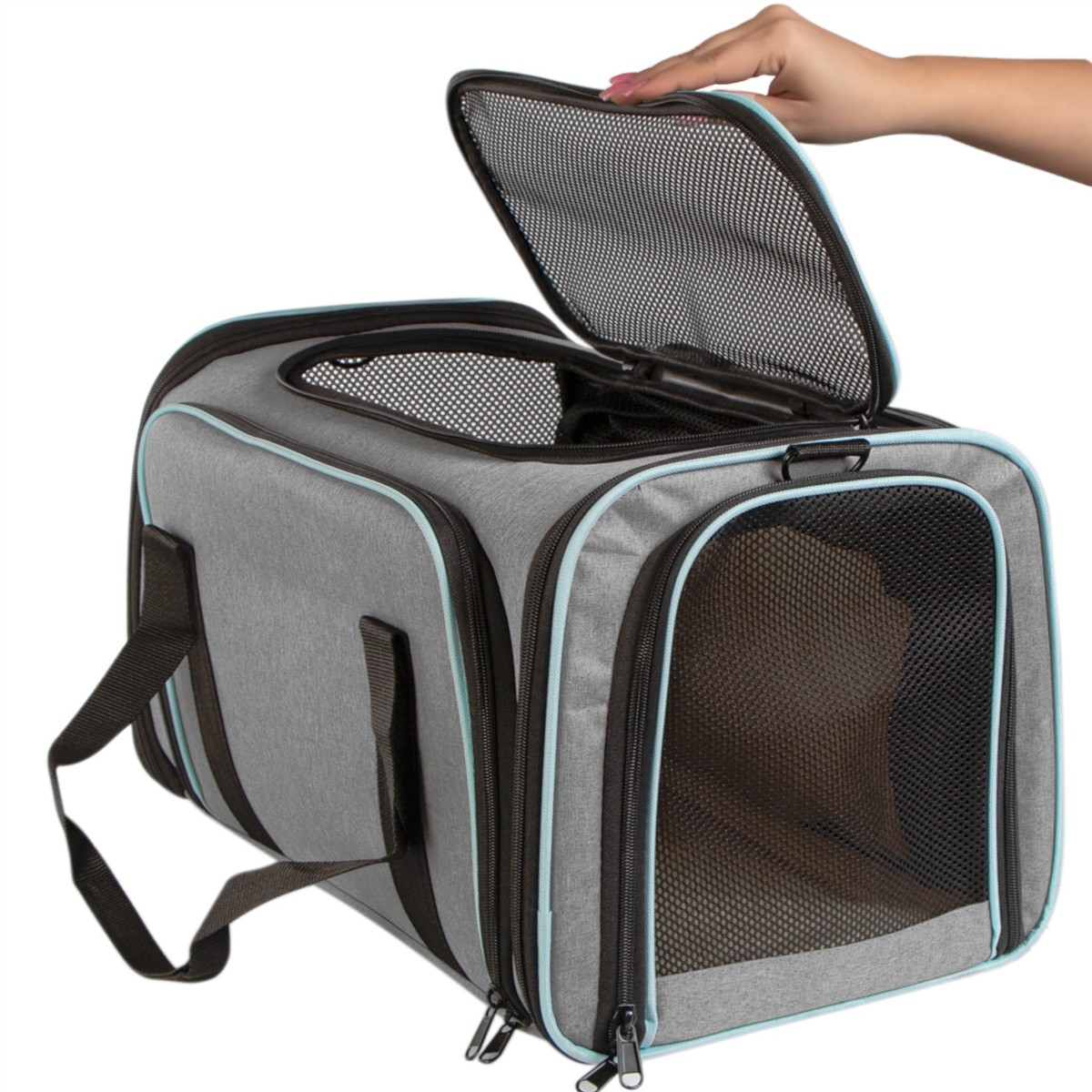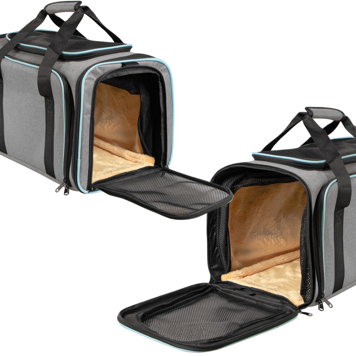 Transporter dla kota lub psa. Idealny do podróży małych i dużych oraz do wizyty u weterynarza. Duża sztywność w połączeniu z bardzo odpornym materiałem i pancernymi zamkami sprawią, że Twój kot czy pies nie będzie w stanie zniszczyć tego transportera i będzie mógł się cieszyć podróżami bez końca. Otwierana w całości przednia i tylna klapa, rozkładane "namioty" po obu stronach torby czy mała smycz wewnątrz to tylko niektóre udogodnienia.