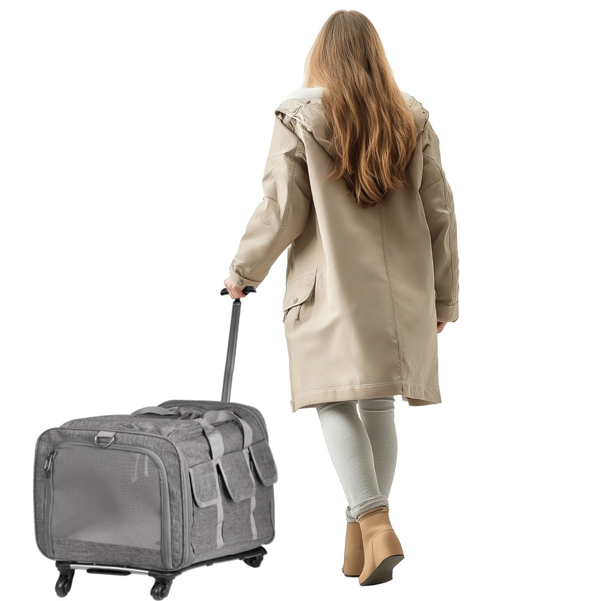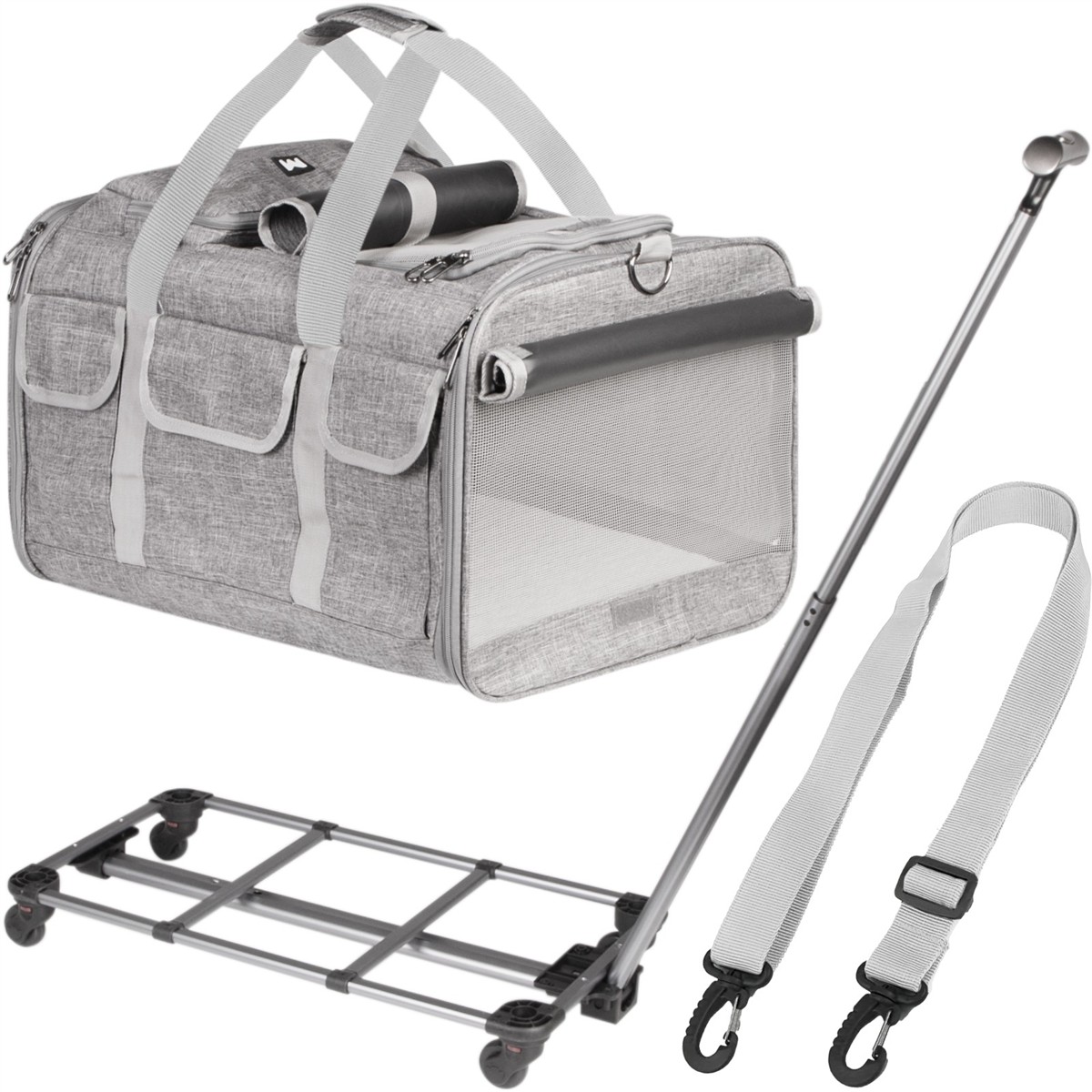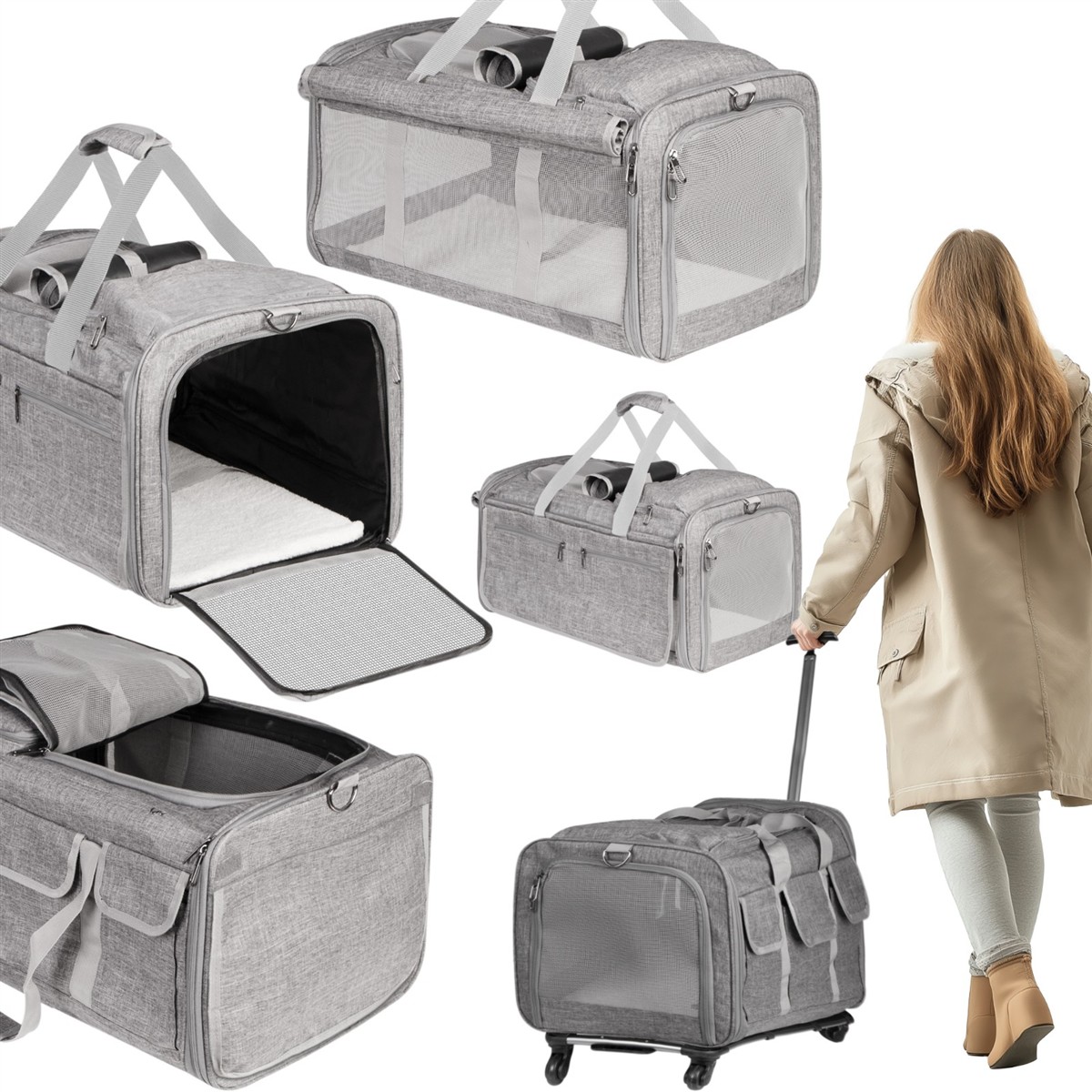 Transporter na kółkach dla kota lub psa. Idealny do podróży małych i dużych oraz do wizyty u weterynarza. Duża sztywność w połączeniu z bardzo odpornym materiałem i pancernymi zamkami sprawią, że Twój kot czy pies nie będzie w stanie zniszczyć tego transportera i będzie mógł się cieszyć podróżami bez końca. Otwierana w całości przednia i tylna klapa, otwierana dodatkowa klapa na górze i z przodu, smycz wewnątrz torby to tylko niektóre udogodnienia.