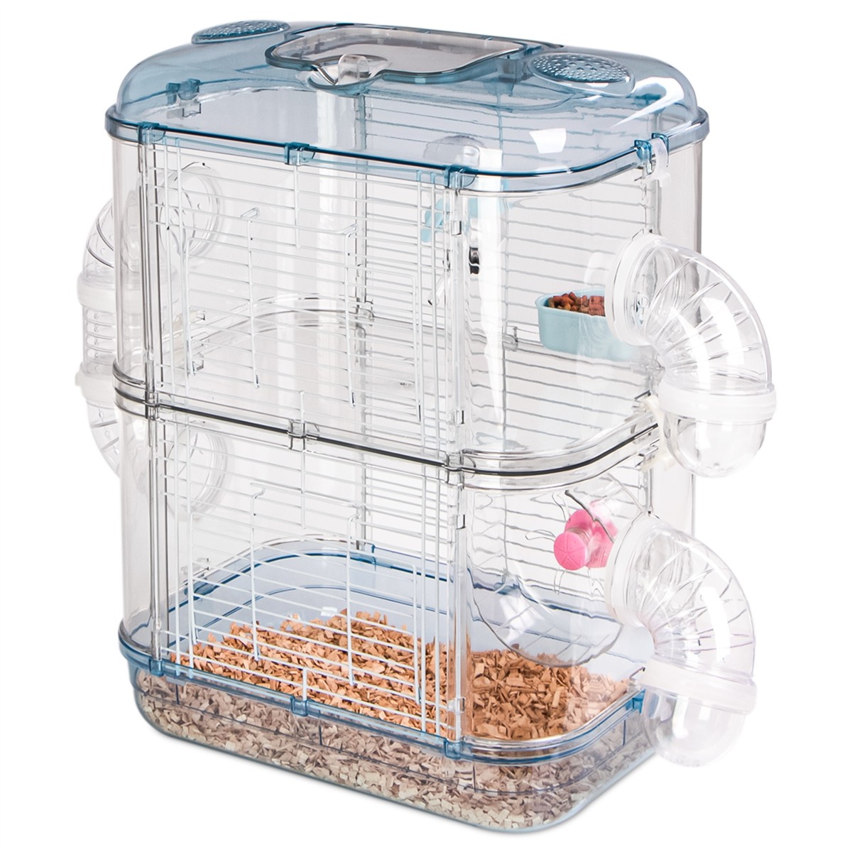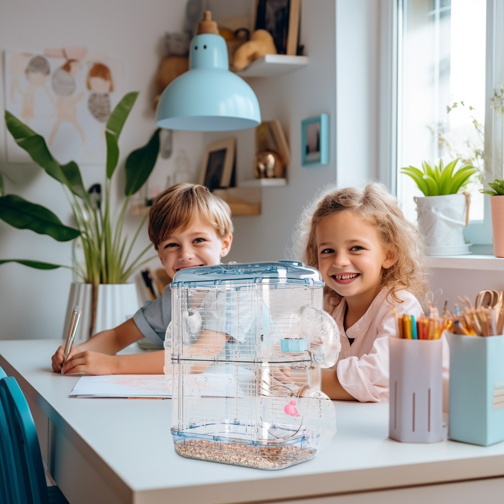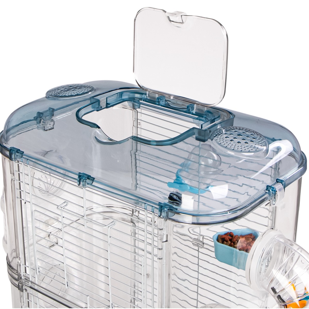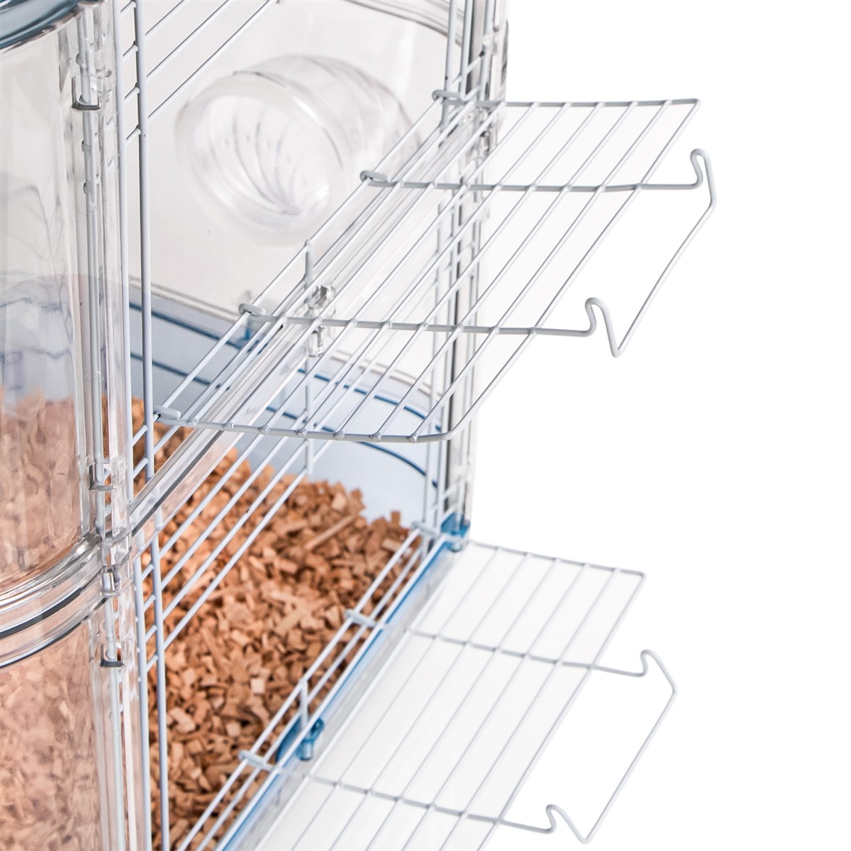 Poznaj naszą wyjątkową klatkę dla chomika lub myszy, która łączy funkcjonalność z nowoczesnym designem. Klatka ta wyróżnia się przezroczystym plastikowym korpusem, który umożliwia łatwe obserwowanie Twojego pupila.