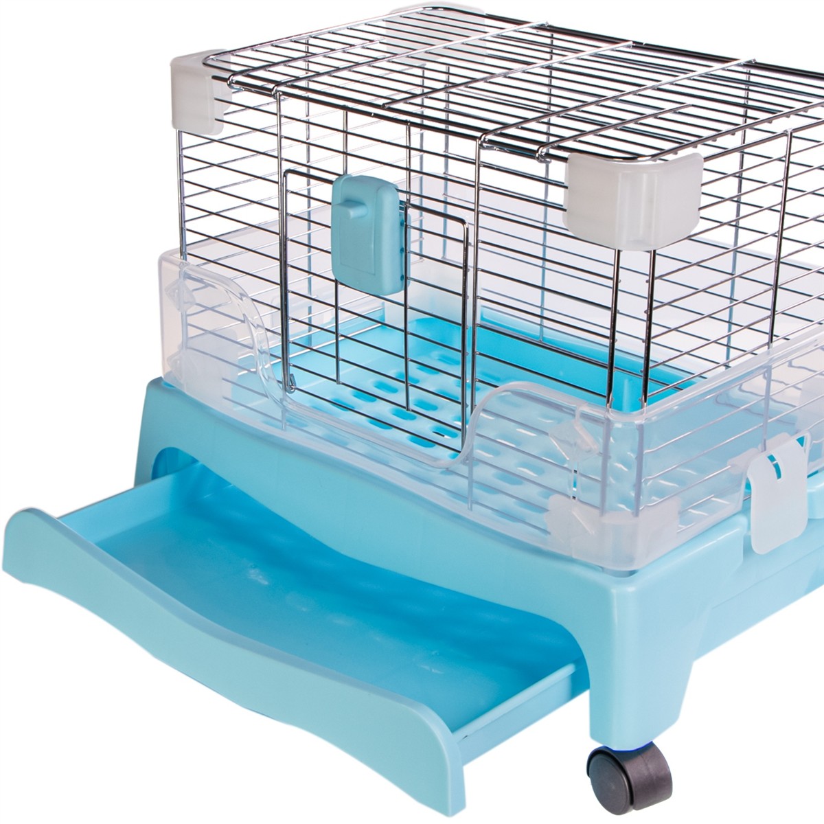 - Łatwe czyszczenie: Pod klatką znajduje się łatwo wyjmowana szuflada, która pozwala szybko i bezproblemowo usunąć odchody i mocz.