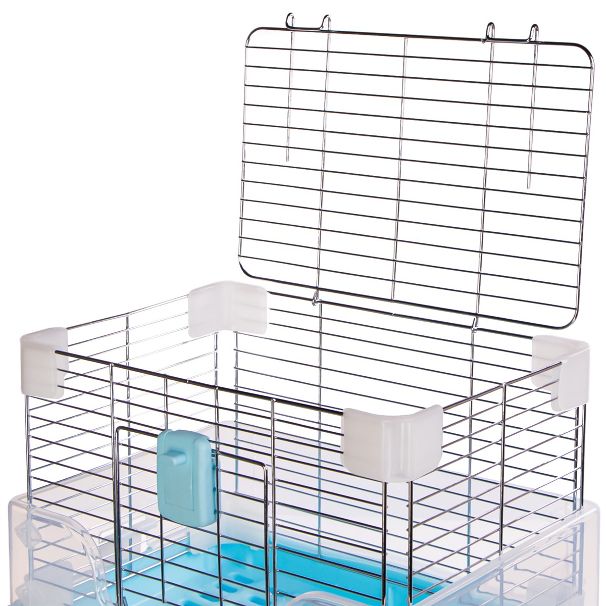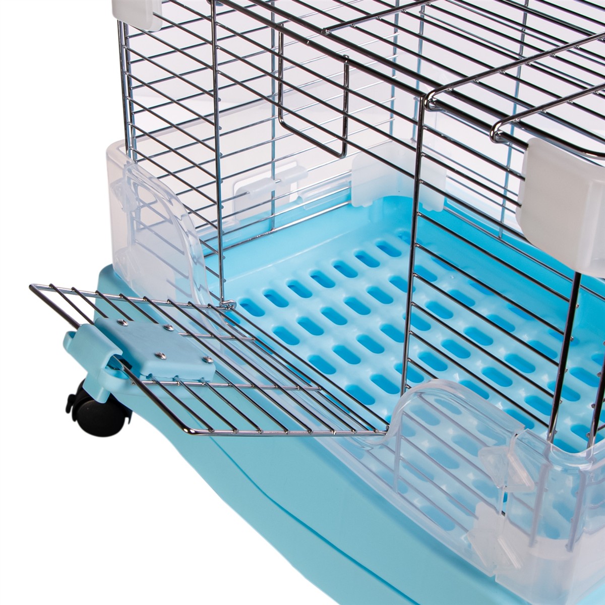- Higiena: Dno klatki wykonane jest z perforowanej plastikowej kratki, co umożliwia przelatywanie odchodów do szuflady poniżej, utrzymując czystość w klatce.