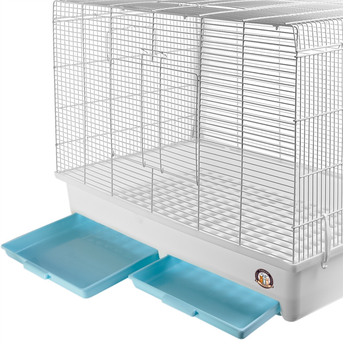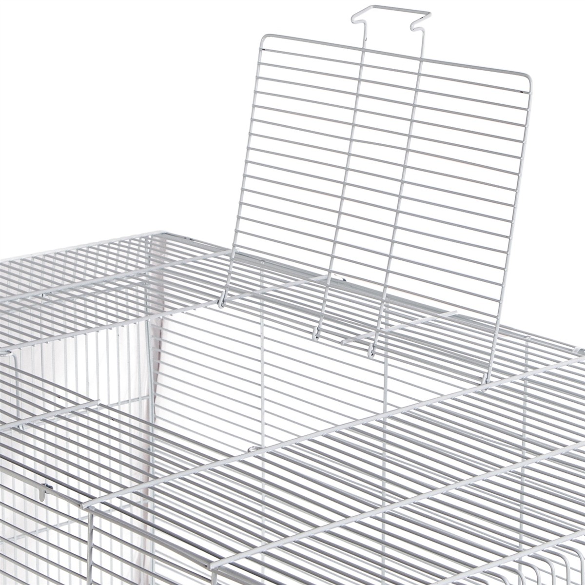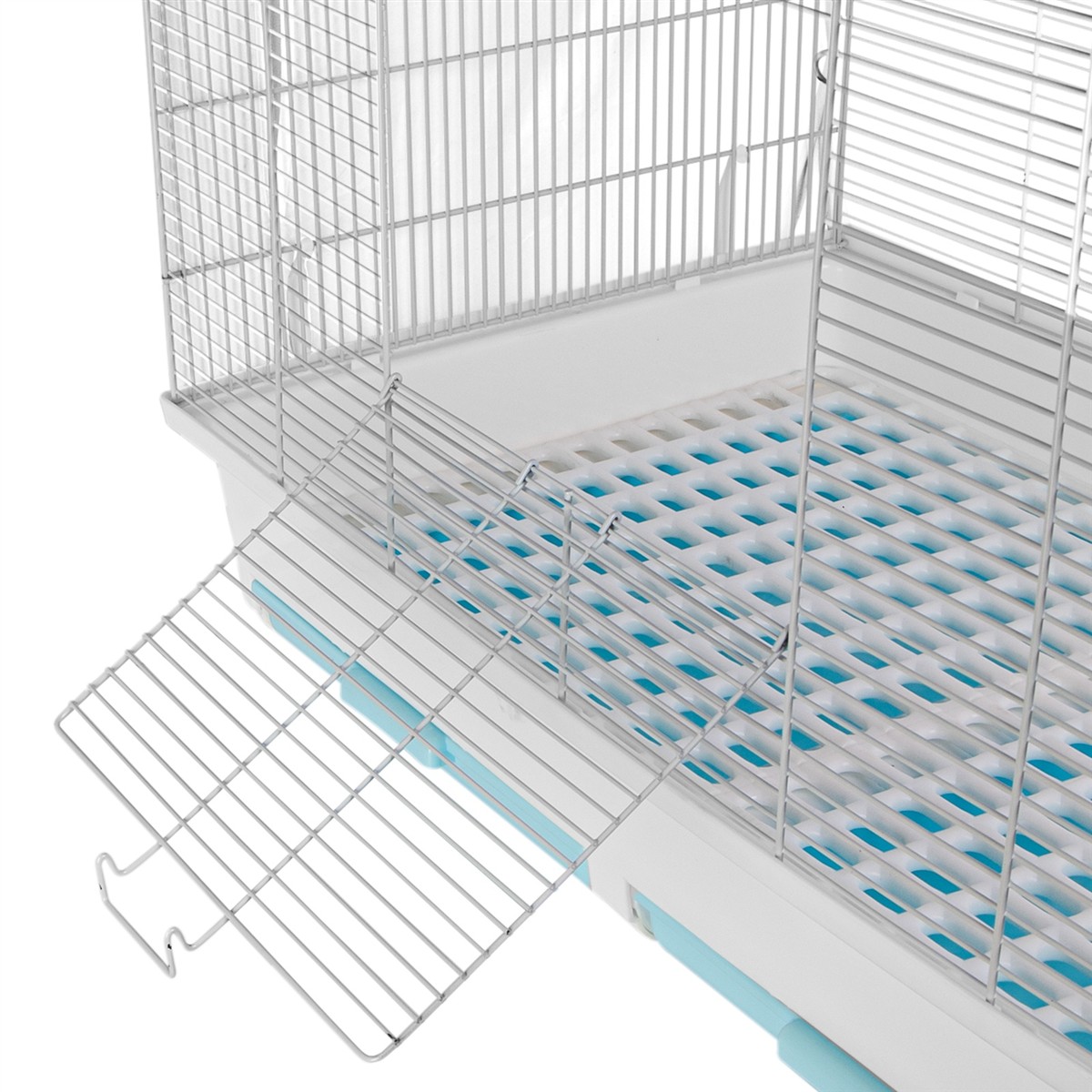 - Higiena: Dno klatki wykonane jest z perforowanej plastikowej kratki, co umożliwia przelatywanie odchodów do szuflady poniżej, utrzymując czystość w klatce.