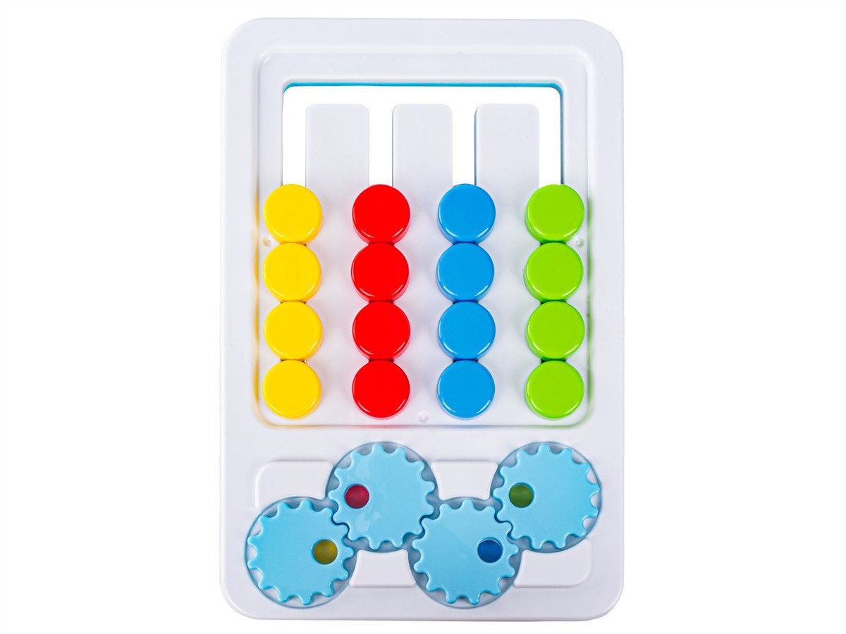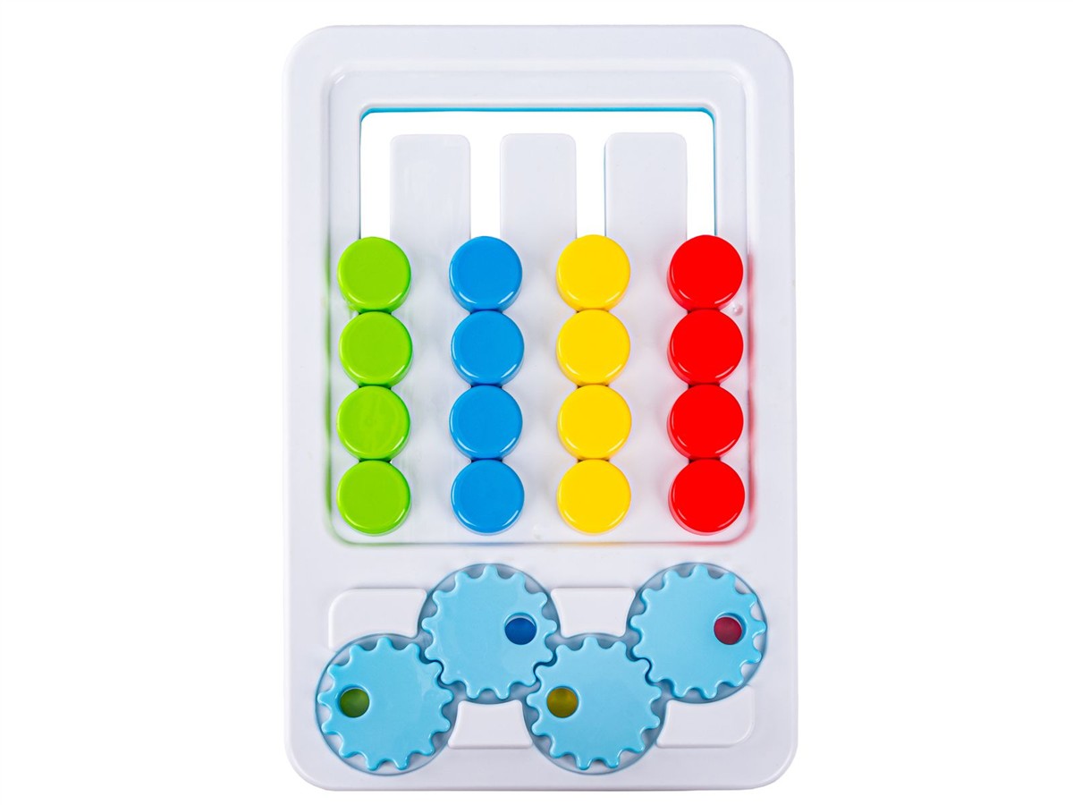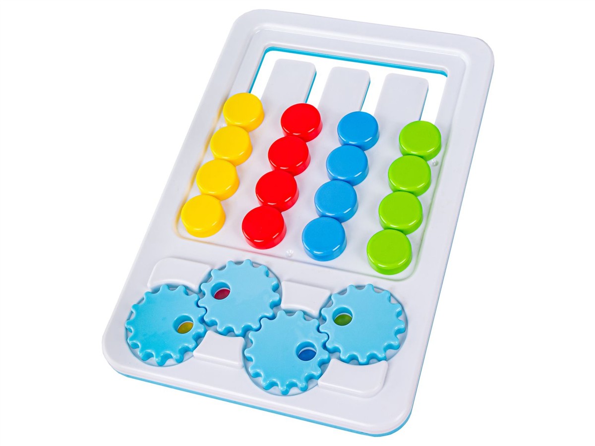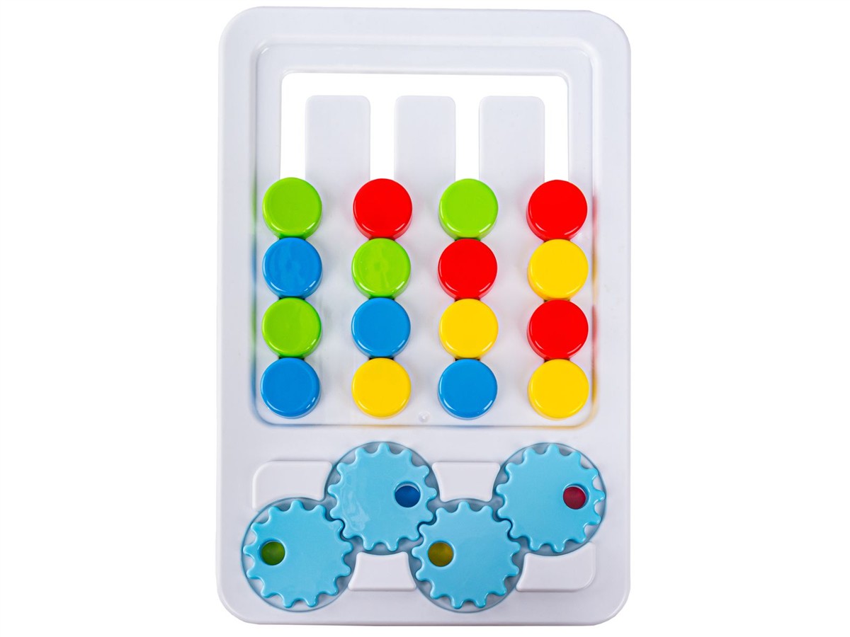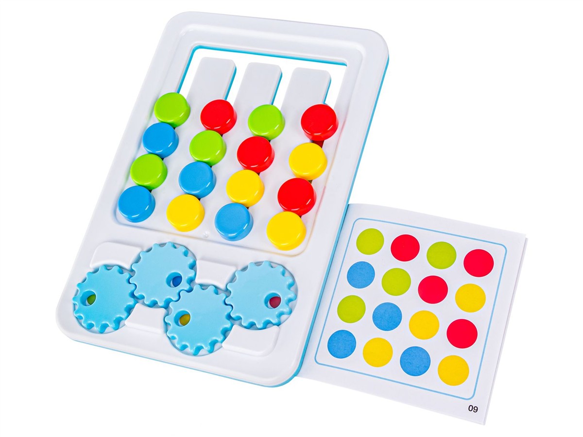 Zasady gry:Plansza posiada ruchome, kolorowe przyciski oraz koła zębate. Najpierw za pomocą zębatek wybieramy układ kolorów. Następnie przesuwamy przyciski w taki sposób aby uzyskać wylosowany układ kolorów (wystarczy, że zgadzać się będą kolory na samej górze). To nie takie proste, ponieważ pozostałe guziczki mogą nas blokować. Zestaw zawiera także książeczkę z wyzwaniami do ułożenia. Wtedy aby zaliczyć zadanie wszystkie guziczki muszą zgadzać się z wybranym układem. | ![]() |