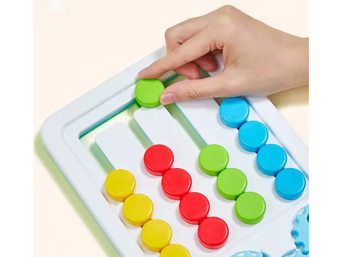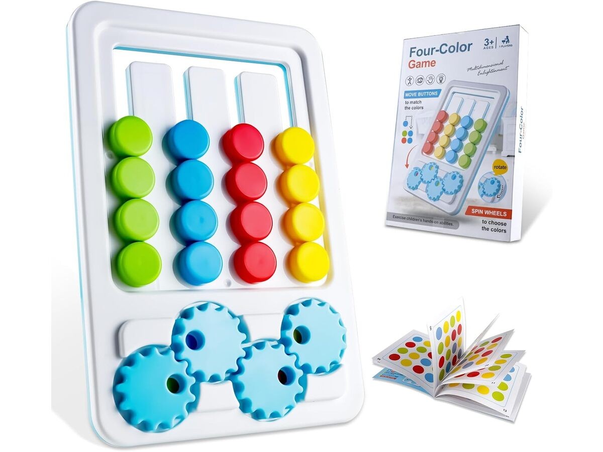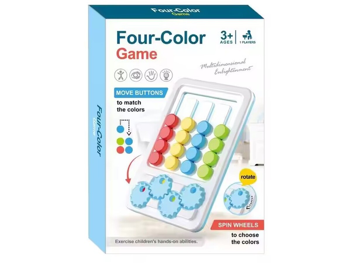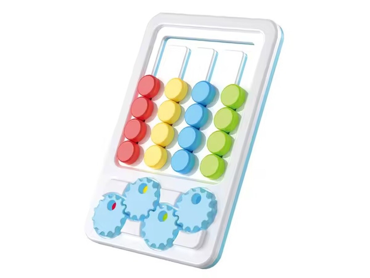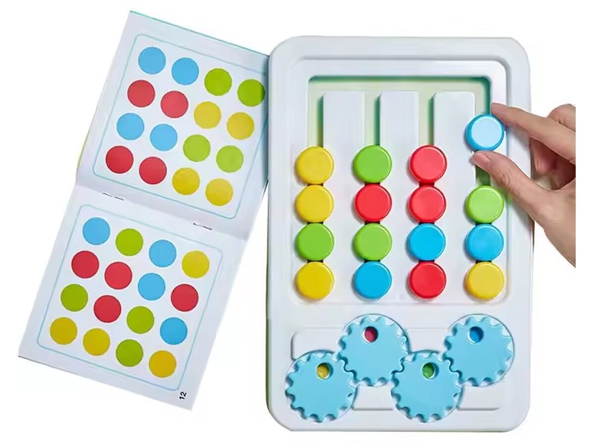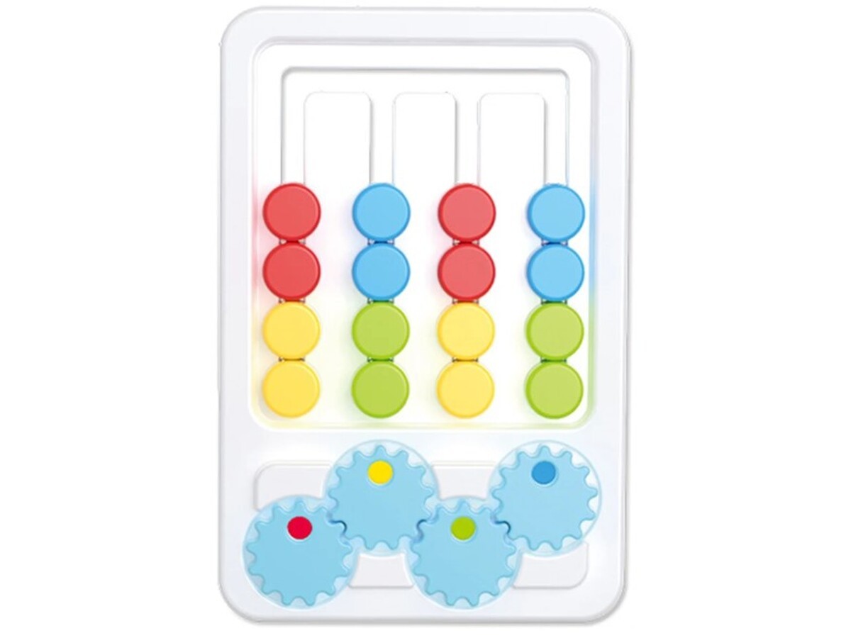 Zasady gry:Plansza posiada ruchome, kolorowe przyciski oraz koła zębate. Najpierw za pomocą zębatek wybieramy układ kolorów. Następnie przesuwamy przyciski w taki sposób aby uzyskać wylosowany układ kolorów (wystarczy, że zgadzać się będą kolory na samej górze). To nie takie proste, ponieważ pozostałe guziczki mogą nas blokować. Zestaw zawiera także książeczkę z wyzwaniami do ułożenia. Wtedy aby zaliczyć zadanie wszystkie guziczki muszą zgadzać się z wybranym układem. | ![]() |