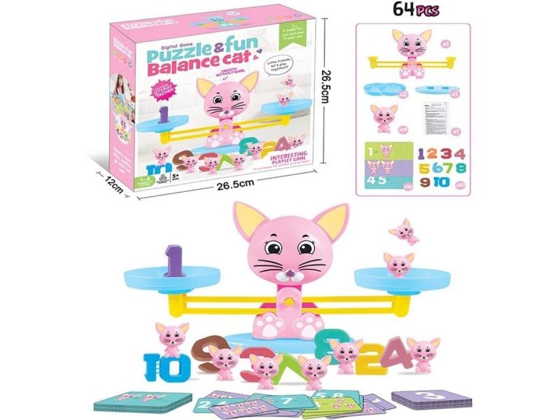 Spójrz, jakie wspaniałości kryje ta zabawka: kolorowa waga szalkowa z figurką kotka, odważniki w kształcie małych kotków, cyfry i karty z zadaniami zapewnią Ci długie godziny ciekawej zabawy, która doprowadzi Cię do fascynujących odkryć!