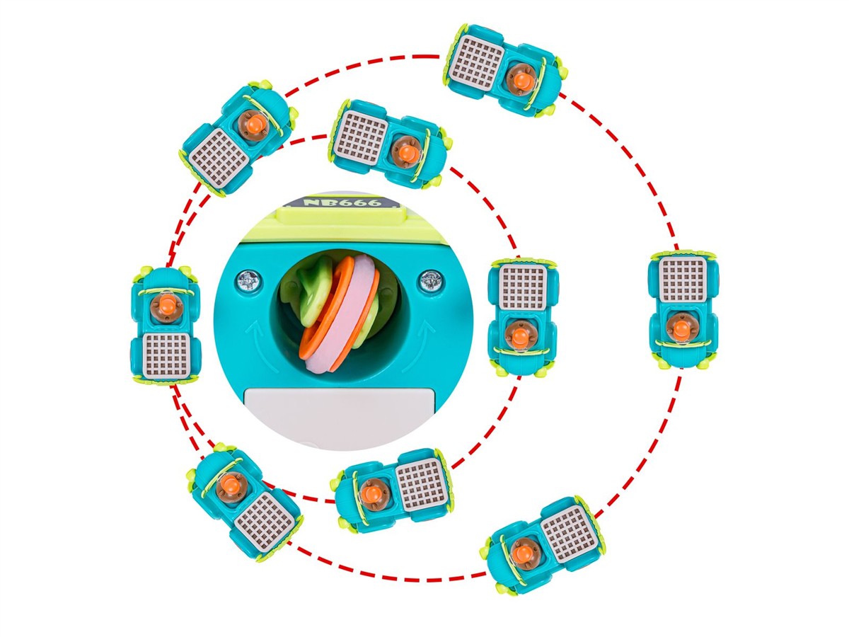 Regulacja skrętuSamochód dodatkowo posiada regulację skrętu, dzięki czemu może w zależności od ustawienia zataczać koła o średnicy od 40 cm aż do 120 cm. Regulację ustawiamy pokrętłem na podwoziu auta. | ![]() |
